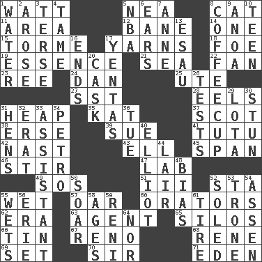 ACROSS 1. Electrical Unit 5. Teachers' org. 8. Feline 11. Type of rug 12. Object of repulsion 14. Single 15. Singer Mel 17. Tall tales 18. Enemy 19. Substance 21. Ocean 22. Air blower 23. Portuguese money of account (variant) 24. Daniel's nick name 25. Shoshoni 27. Fast jet (abbr.) 28. Snakelike fish 31. Pile 35. Krazy ___ of comics 37. Highlander 38. Celtic language 39. Institute legal proceedings 41. Ballerina skirt 42. Political cartoonist Thomas 43. Pipe bend 45. Connect, as a bridge 46. Tumult 47. Experiment locale 49. Distress signal 51. One more than two 52. R.R. building 55. Soggy 57. Rowing implement 60. Speakers 62. Period 63. Representative 65. Grain storage towers 66. Shallow baking pan 67. Former U.S. Attorney General Janet 68. French philosopher Descartes 69. Arrange properly for use 70. Title for a knight 71. Genesis locale DOWN 1. Wetness 2. Came up 3. Laconic 4. Docile 5. Basketball assoc. 6. Hearing organs 7. Singer Murray 8. Java holder (2 wds.) 9. Small Philippine buffalo 10. Adolescent 13. He sold his birthright 16. Extremities 17. Gossips 20. Keg 26. Trials 29. Globular water bottle used in Asia 30. Make senseless or dizzy 31. Coop moms 32. Part of Q.E.F. 33. Helper 34. Stone: prefix 36. Third day of the wk. 40. American author Paul (1891-1958) 44. Den 48. Prejudice 50. Fly high 52. Having a sole or soles 53. Marketplace scale 54. NE Netherlands city 55. Soaks 56. One of the Great Lakes 58. Eras 59. Painter Guido (1575-1642) 61. Become fatigued 64. Not either