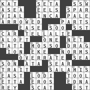ACROSS 1. Krazy ___ of comics 4. Stalk of a moss capsule 8. Compass dir. 11. Toward the sea 13. Snakelike fish 14. Practice fight 15. Small bottle 16. South American Indian 17. Diluted with white 18. Moved like an arrow 21. Pieces 22. Comfort 23. "Barney Miller" actor Jack 25. Fast jet (abbr.) 26. Automobile 29. Copy Pinocchio 32. Upward 34. Single 35. Fish or hair follower 38. Jacques of French films 39. With motion or animation 41. To trail on the ground 43. Electrically charged atom 44. Make supply last 45. Typical models 46. Make much ado about nothing 50. Ocean 51. Manchild 54. "One Day ___ Time" 55. Shrivel 57. Distinguishing feature 59. Deli grouping 63. 90 degrees 64. Farming town in central California 67. Implement 68. Singer James 69. Greek god of love 70. Pulitzer Prize-winning author Ferber 71. Marina Del _, California 72. Leave at once 73. Eastern Standard Time (abbr.) DOWN 1. Polynesian shrub of the pepper family 2. SW Saudi Arabia district 3. Separate forcefully 4. Beer mug 5. Car or cant ending 6. Affectionate concern, for short 7. White ___ sheet 8. Practice fights 9. Table seasonings 10. Obtain by seizing forcibly or violently 12. Medicinal plant 14. Health resort 19. Electrical Unit 20. Compass dir. 21. Luau course 23. Without 24. Butter sub 26. Domesticated feline 27. Jai _ 28. Printing process, for short 30. Failure 31. Inside; within (prefix) 33. Fine (Spanish) 36. Blunders 37. Not wild 39. Confront 40. Gumbo ingredient 42. Girls' org. (abbr.) 45. Be tempered by heat 47. Large container 48. Help 49. Afternoon social gathering 51. Guide 52. Speak pompously 53. Thoroughly unpleasant 56. Assign a rank or rating to 58. Call ___ day 60. Method 61. Charged particles 62. Narrow board 64. French article 65. The grampus (Milton) 66. ___ good deed
