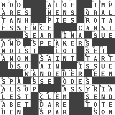 ACROSS 1. Lower and raise head in agreement 4. Medicinal plant 8. Mischievous child 11. Ancient Greek god of war 13. Not women's 14. Taken by mouth 15. Hyperbolic tangent 16. Sliced desserts 17. Roll call or roster of names 18. Core 21. 2nd pers. sing. pres. of can (arch.) 22. Burn superficially 23. _ tizzy (2 wds.) 25. Take to court 26. Also 29. Orators 32. Damp 34. Car dealer's back yard 35. Put into a specified state 38. At once, immediately (arch.) 39. Inhabitant of Heaven 41. Small pie 43. Bear (Spanish) 44. The 18th letter of the Arabic alphabet 45. Come out of 46. Nomad 50. Car or cant ending 51. Health resort 54. Compass dir. 55. Lyric poems 57. Columnist Joseph or Stewart 59. Nineveh was its capital 63. For fear that 64. Clement's nick name 67. Transmit 68. Collude with 69. Have the gumption 70. Carryall 71. Lair 72. Coast Guard woman 73. Boy, to dad DOWN 1. Nathan's nickname 2. Mouths or openings 3. Cub Scout units 4. Electrical Unit 5. Flowery wreath 6. Single 7. Curvy letter 8. Metal shackles 9. Taiwanese island in East China Sea 10. Food holder 12. "______ My Girl" (Turtles hit) 14. Mouth or opening 19. A home for chicks 20. Head covering 21. Automobile 23. Image 24. Remaining after all deductions 26. Housemaid (var.) 27. Words to Nanette 28. "Vaya con ____" 30. Place in a line 31. Fast planes 33. Frozen precipitation 36. Relaxation 37. Loyal 39. Without 40. Assistant 42. Nine, plus one 45. Angers 47. Viper 48. Wanderer 49. Begley and Asner 51. First course 52. First-year military academy student 53. NE Netherlands city 56. System (abbr.) 58. Baseball player Mel 60. Vintage cars 61. To the inside or interior of 62. Arabian gulf 64. Music discs 65. Infant locale 66. Period