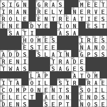 ACROSS 1. Attach a signature 5. Pate de foie ____ 9. Confront 13. SW Asia republic 14. Have trust in 15. Effrontery 16. Hero or heavy, e.g. 17. Pleas 19. Compass dir. 20. Color 21. Electrically charged atom 22. Eastern Standard Time (abbr.) 23. Suttee (variant) 25. White ___ sheet 26. Residences 30. Angers 34. First name in cosmetics 35. Billionth: prefix 36. Does sums 39. Killed 42. Global Positioning Systems (abbr.) 43. Painter Guido (1575-1642) 44. Buy and sell 46. It was, poetically 47. Gurus 48. Pet locale 51. Smallest unit of an element 54. Call ___ day 57. Lubricate 58. Title for a knight 60. Actress Charlotte 62. Parts 65. Land 66. Choose 67. A really long time 68. Conclusions 69. Habitations of wild animals 70. Back-to-school mo. 71. Olfactory organ DOWN 1. Title for a man of rank and authority 2. Metal shackles 3. An organ shaped like a helmet 4. Compass dir. 5. Jennifer or Joel 6. French philosopher Descartes 7. Keyboard modifier key 8. Damascus' land 9. Was introduced to 10. 4th largest of the Great Lakes 11. Nights before holidays 12. Trial 15. Grandmother 18. Greek goddess of the dawn 20. "Vaya con ____" 24. College paper 27. Mountains (abbr.) 28. Snakelike fish 29. Theater features 30. Swallow 31. Hit sharply and swiftly 32. Followers of ems 33. Distress signal 36. Tate display 37. Morning condensation 38. Heredity factor (abbr.) 40. Retirement account (abbr.) 41. Tired old horse 45. Letter starter 48. Spoils 49. The 18th letter of the Arabic alphabet 50. Entreaties 52. U. of Maine site 53. Women servants 54. On the rocks 55. Lacquered or enameled metalware 56. So be it 58. Obstruct or block passage 59. Is not 61. Otherwise 63. Personal Computers (abbr.) 64. Born 65. Elected rep.