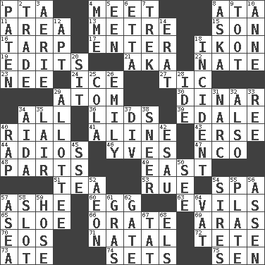 ACROSS 1. Parent Teacher Association (abbr.) 4. Confront 8. _ moment's notice (2 wds.) 11. Length times width 13. Distance measurement (Brit.) 15. Male offspring 16. Canvas cover 17. Keyboard key 18. Picture 19. Proofreads 21. Alias (abbr.) 22. Nathan's nickname 23. Born 24. Frozen water 27. Nervous spasm 29. Smallest unit of an element 30. Middle Eastern gold or silver currency 34. 100% 36. Hats (slang) 39. Peak District village in England 40. Monetary unit of Yemen 41. Place in a line 43. Celtic language 44. Goodbye (Sp.) 46. Jacques Cousteau's middle name 47. Non-commissioned officer (abbr.) 48. Pieces 49. Compass direction 51. Afternoon social gathering 53. Sorrow 54. Health resort 57. American tennis player Robert 60. Ovum 63. Vices 65. A type of plum 66. Declaim 69. Caspian sea tributary 70. Greek goddess of the dawn 71. Relating to or accompanying birth 72. Wig 73. Had dinner 74. Arranges properly for use 75. Elected rep. DOWN 1. Eucharist need 2. Buy and sell 3. Nest on high 4. Madame (abbr.) 5. Car or cant ending 6. Singer James 7. Long journey 8. "____ silly question..." 9. A blast of a horn 10. Singer Murray 12. Fitting 14. Part of Q.E.F. 18. Happening 20. Be seated 25. Root beer relative 26. Poet Dickinson 28. Binary compound 29. One to whom something is allotted 31. Drug cop 32. In addition 33. Portuguese money of account (variant) 34. Opera by Verdi 35. Den 37. HTML Container Element 38. Scornful expression 40. Strike 42. Son of Isaac 45. Compass dir. 50. Perceive with the eye 52. Period of immesurable duration 54. Fathers 55. Food holder 56. NE Netherlands city 57. At sea 58. Narrow, elongated depression 59. Stockings 61. Pate de foie ____ 62. Yard entry 64. Large container 67. Make lace 68. Raised railways