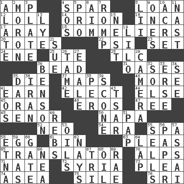 ACROSS 1. Electrical Unit 4. Practice fight 8. Grant temporary use of 12. Hang loosely or laxly 14. Constellation of myth 16. South American Indian 17. Like ___ of sunshine 18. Wine waiters 20. Hauls 22. 23rd letter of the Greek alphabet 23. Arrange properly for use 24. Compass dir. 25. Shoshoni 28. Affectionate concern, for short 30. Necklace unit 31. Fertile tracts in a desert 35. Pass on 37. Atlas contents 40. Greater amount 41. Merit 42. Choose 44. Otherwise 45. Mouths or openings 46. Greek god of love 47. To riddle 48. Sir (Sp.) 50. California wine valley 52. Modern: prefix 54. Epoch 55. Health resort 58. Ovum 61. Storage container 63. Entreaties 65. Interpreter 70. High mountains 71. Nathan's nickname 72. Damascus' land 73. Entreaty 74. At sea 75. Drop; flow; fall 76. Indian title of respect (Mr.) DOWN 1. Having winglike extensions 2. Person of subnormal intelligence 3. Food holder 4. Distress signal 5. Adept person 6. Direct toward a target or goal 7. Play 8. Cards in a Roman deck? 9. Singles 10. Measure of real estate 11. Political cartoonist Thomas 13. Potassium hydroxide 15. Egg locale 19. _ and Stitch 21. Take to court 26. Docile 27. Peak District village in England 29. Device for capturing images 30. Gillaume's butler role 32. Flatfish 33. Celtic language 34. Perceive with the eye 35. Have the gumption 36. SW Asia republic 38. For each 39. Biscuitlike quick bread 41. Greek goddess of the dawn 43. Russian ruler of old 49. Confederate soldiers (slang) 51. Infant food 53. Lubricates 55. Exchanges for money 56. Some stationery 57. Slender Brazilian palm 58. Inactive volcano in Sicily 59. Pate de foie ____ 60. Yard entry 62. Negative votes 64. Pet locale 66. Teachers' org. 67. Three (prefix) 68. Petroleum 69. Actress Charlotte