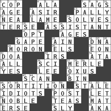 ACROSS 1. Police officer (slang) 4. According to 7. Settles 11. Grow older 12. SW Saudi Arabia district 13. Friendly 14. Teachers' org. 15. Unable to walk 16. Finds the solution 17. Laconic 19. Aide 21. Choose 23. Eras 24. Open wide 25. The 18th letter of the Arabic alphabet 26. Heredity factor (abbr.) 29. Person of subnormal intelligence 30. Raised railways 31. Age 32. ___ good deed 33. Big collection agency 34. "One Day ___ Time" 35. 100% 36. _-fi 37. Haggard of country music 40. Consenting reply 41. Area sheltered from the wind 42. Amu Darya 43. Examine minutely or intensely 45. Storage container 46. Decision 51. Lacking originality or spontaneity 55. Foolish or stupid persons 56. Mail 58. Allow 59. Having high moral qualities 60. Afternoon social gatherings 61. Floor covering 62. Celtic language 63. Playfully artful 64. Alias (abbr.) DOWN 1. Patter 2. Double curve, resembling the letter S 3. Lightbulb-shaped fruit 4. White ___ sheet 5. Pale green bean 6. Ancient Greek god of war 7. Table seasonings 8. Inventor's middle name 9. Small, secluded valley 10. System (abbr.) 12. City in Syria 13. Airs 16. Signals 18. Fly high 20. Moves on water 22. "___ Little Indians" 24. Finish lines 25. Nest on high 26. Allots cards 27. Short letter 28. Santa ___, CA 29. Undercover agent 32. 24 hours 33. Ancient Celtic tribe of eastern Britain 36. Narrow boards 37. Crowd into 38. Is 39. Undersized animal 43. Fur scarf 44. Quote 46. Trig term 47. Aroma 48. Chest bones 49. Chooses 50. Christmas carol 52. _ mater 53. Path through which fluid escapes 54. Singer James 57. Declare