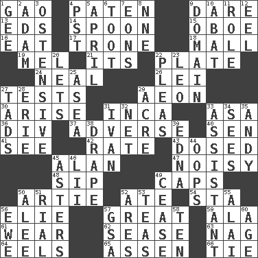 ACROSS 1. E Mali city 4. Eucharist need 9. Have the gumption 13. Begley and Asner 14. Soup utensil 15. Mitch Miller's instrument 16. Erode 17. Marketplace scale 18. Promenade 19. Cartoonist voice _ Blanc 21. It is 22. Food holder 24. Actress Patricia 26. Flowery wreath 27. Trials 29. Age 30. Ascend 31. South American Indian 33. White ___ sheet 36. HTML Container Element 37. Contrary to your interests or welfare 40. Elected rep. 41. Perceive with the eye 42. Pace 43. Administered medicine 45. Actor Alda or Thicke 47. Annoyingly loud 48. Small drink 49. Balmoral and tarboosh 50. Nick name for Arthur 52. Had dinner 54. R.R. building 56. Writer Wiesel 57. Relatively large 59. Insect wing 61. Erode 62. Gospel singer Marvin 63. Tired old horse 64. Snakelike fish 65. NE Netherlands city 66. Neckwear DOWN 1. Unit of force equal to gravity 2. First man 3. Clearly or manifestly demonstrative 4. Pacific Standard Time (abbr.) 5. Showery time 6. A blast of a horn 7. Immeasurably long periods of time 8. Compass dir. 9. Kingdom 10. Blind as ____ 11. Hero or heavy, e.g. 12. Snakelike fish 20. Allows 22. Entreaties 23. Lion 25. At sea 27. Bits 28. One of the Great Lakes 29. Land measure 31. _ the terrible 32. Fish or hair follower 33. Aide 34. Perceives with the eye 35. Actor Griffith 38. Window treatment 39. Pulitzer Prize-winning author Ferber 44. I made a mistake 45. Michaelmas daisies 46. Cards in a Roman deck? 49. Desist 50. Toward shelter 51. Monetary unit of Yemen 52. Ancient Greek god of war 53. Beverages made from leaves 55. Jai ____ 56. She-sheep 57. Girls' org. (abbr.) 58. Nine, plus one 60. Mature