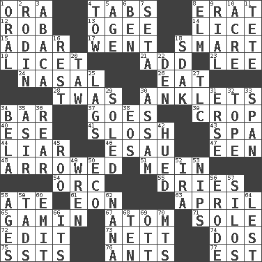 ACROSS 1. Mouth or opening 4. Bar bills 8. Part of Q.E.F. 12. Director Reiner 13. Double curve, resembling the letter S 14. Louse (plural) 15. The sixth month of the Jewish calendar 17. Gone 18. Don Adams' spy role 19. It is permitted: Lat. 21. Increase 23. Area sheltered from the wind 24. Relating to the nose 26. Erode 28. It was, poetically 30. Short socks 34. Oblong piece of solid material 37. Leaves 39. Riding implement 40. Compass dir. 41. Agitate, as a liquid 43. Health resort 44. One who doesn't tell the truth 46. He sold his birthright 47. Car or cant ending 48. Moved like an arrow 51. Chow _ 54. The grampus (Milton) 55. Frees from moisture 58. Had dinner 61. A really long time 63. Showery time 65. Street urchin 67. Tiny particle 71. Flatfish 72. Prepare for publication 73. Remaining after all deductions 74. Two (Sp.) 75. Fast planes 76. Pismires 77. Eastern Standard Time (abbr.) DOWN 1. Taken by mouth 2. "The Thinker" sculptor 3. Phillipine bananalike plant 4. Pull behind 5. Mature 6. Benjamin's nick name 7. Stalk of a moss capsule 8. Shade tree 9. Monetary unit of Yemen 10. 43,560 square feet 11. False hair 16. Repose 18. Neighbor of Neb. 20. The 23rd letter of the Hebrew alphabet 22. Lair 25. Falls behind 27. Affectionate concern, for short 29. Having a sole or soles 30. Indian state 31. Celtic language 32. Drink excessively 33. Connect, as a bridge 34. Actor Lugosi 35. SW Saudi Arabia district 36. Buttocks 38. Greek goddess of the dawn 42. Became colored 45. Friend of Pooh 49. Songbird 50. Environmental prefix 52. Lyricist Gershwin 53. Pinches, bites 56. Eat (away) 57. Grain storage towers 58. Eons 59. Small boys 60. Send forth 62. Nanny 64. For fear that 66. ___ a Wonderful Life 68. Nine, plus one 69. Baseball player Mel 70. Mountains (abbr.)