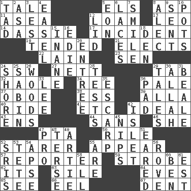 ACROSS 1. Falsehood 5. Raised railways 8. Viper 11. At sea 12. Rich soil 13. Lion 14. Small ungulate mammals of Africa 17. Event 19. Watched over 21. Opts 22. (Had) reclined 23. Elected rep. 24. Compass dir. 27. Remaining after all deductions 29. Bar bill 32. White Person, in Hawaii 34. To separate or throw off 36. Light colored 37. Mitch Miller's instrument 38. Curvy letter 39. Silent film actress Nazimova 40. Travel on or in a vehicle 41. And so on (abbr.) 42. Standard of perfection 43. Followers of ems 44. Without 46. A female animal or person 47. Parent Teacher Association (abbr.) 50. Cause heat under the collar 52. A viewer who gazes fixedly 55. Seem 57. Newsperson 59. Disco prop 62. ___ a Wonderful Life 63. Filth; sediment 64. Nights before holidays 65. Perceive with the eye 66. Snakelike fish 67. Gouge DOWN 1. Small boy 2. White ___ sheet 3. For fear that 4. Artist's stand 5. A really long time 6. Shoestrings 7. Grin 8. Actor Baldwin 9. Posted 10. Plant holders 12. Flaplike covering 15. Silly 16. Singer Brickell 18. Lair 20. Main course 24. Dinah or Pauly 25. Unit of acoustic absorption 26. Forest 28. Trials 29. Falsehoods 30. Assad's deity 31. Calif. Air Force Base 33. Area sheltered from the wind 35. Fortification 36. Writing tablet 42. Small island 45. Pinches, bites 47. Adept person 48. Laconic 49. Nick name for Arthur 51. Having ears or earlike features 52. Indian titles of respect 53. Wig 54. Domed church section 55. "We ___ not amused" (Victoria) 56. Be footloose 58. Pipe bend 60. Benjamin's nick name 61. Eastern Standard Time (abbr.)