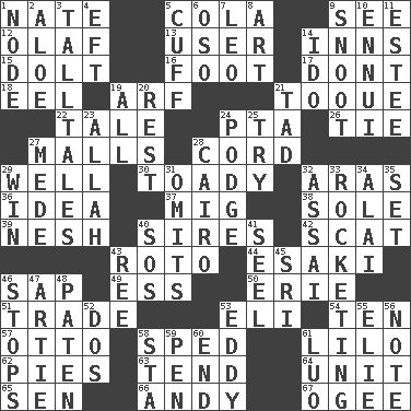 ACROSS 1. Nathan's nickname 5. Root beer relative 9. Perceive with the eye 12. Norwegian king 13. One who makes use of a thing 14. Lodging establishments 15. Dunce 16. 12 inches 17. Do not 18. Snakelike fish 19. Sandy's bark 21. Woman's close-fitting hat 22. Lie 24. Parent Teacher Association (abbr.) 26. Standoff 27. Promenades 28. Drawstring 29. Not ill 30. Sycophant 32. Ancient river in northeast Turkey 36. The content of cognition 37. Russian fighter aircraft 38. Not divided or shared with others 39. Soft 40. Male parents of animals 42. Scram, to a cat 43. Printing process, for short 44. 1973 Nobel Price Winner (Physics) Leo 46. Plant excrement 49. Double-curved letter 50. One of the Great Lakes 51. Swap 53. Biblical high priest 54. Nine, plus one 57. Von Bismarck 58. Moved rapidly 61. _ and Stitch 62. Sliced desserts 63. Look after 64. A single undivided whole 65. Elected rep. 66. Actor Griffith 67. Double curve, resembling the letter S DOWN 1. Thickened enlargement 2. _ vera 3. Baron Munchausen's specialties 4. Newt 5. Sleeve end 6. Bear (Spanish) 7. Lion 8. Nonscientific branch of learning 9. Snout, nose 10. World-weariness 11. First name in cosmetics 14. Wedding promise 19. Everything 20. State of inaction 21. Bit 23. Assad's deity 24. Plash 25. Attempt 27. Ancient Persian 28. Capital of Egypt 29. Victory 31. Leaves out 32. Slender Brazilian palm 33. Shooting up abruptly 34. Jai _ 35. Put into a specified state 40. Distress signal 41. Stitch closed the eyes of (a falcon) 43. To separate or throw off 45. Indian title of respect (Mr.) 46. Constricts 47. Nick name for Arthur 48. Eucharist need 52. Two (Sp.) 53. Whirlpool 55. Writer Wiesel 56. Short letter 58. R.R. building 59. Animal enclosure 60. Conclude 61. Nilotic language