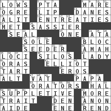 ACROSS 1. Moos 5. Parent Teacher Assoc. 8. Female horse 12. Legendary monster 13. Mouth edge 14. Natives or inhabitants of Denmark 15. Came down and settled, as after flight 16. Pleas 19. Was introduced to 20. More impudent 21. Lick closed 23. Single 24. _ moment's notice (2 wds.) 27. Not divided or shared with others 30. Group of countries in special alliance 31. Sowing specialist 34. Wet nurse 35. Event scenes 38. Grain storage towers 40. Kenny Rogers chart-topper in '80 41. Mouths or openings 42. American author Paul (1891-1958) 44. Small pie 45. Greek god of love 46. The first octave above the treble staff 47. Large container 50. Dad 53. Speakers 57. Actor Linden 59. Supplying deficiencies 63. Greater amount 64. Distinguishing feature 65. Lair 66. Soon (poet.) 67. Helper 68. Compass dir. 69. Tear apart DOWN 1. Rich soil 2. Stares at amorously 3. Compose 4. Put into a specified state 5. Entreaty 6. Metal containers 7. Tenement units (abbr.) 8. Floor protector 9. Black tropical American cuckoo 10. Portuguese money of account (variant) 11. Double-curved letter 14. Have the gumption 17. River (Sp.) 18. Car or cant ending 20. A type of plum 22. Aid 24. _ mater 25. Frog relative 26. Painful 28. French article 29. Singer Brickell 30. Greek mezzo-soprano Agnes 32. Pipe bend 33. Hero or heavy, e.g. 35. Globular water bottle used in Asia 36. Of the mouth 37. Draw slowly or heavily 39. Title for a knight 43. I made a mistake 47. Electrical Unit 48. "We ___ not amused" (Victoria) 49. Make lace 51. Give a jingle 52. Composer Copland 54. Event that recurs at intervals 55. Baking chamber 56. French philosopher Descartes 58. Grant temporary use of 59. R.R. building 60. RI univ. 61. Groovy apt. 62. Sliced dessert 63. Make imperfect