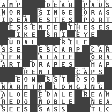 ACROSS 1. Electrical Unit 4. Letter starter 8. Groovy apts. 12. Not either 13. Burn superficially 14. Mouths or openings 15. It may be bright or harebrained 17. _____ Park, CO 18. Left side of a ship or aircraft 19. Gist 21. College papers 23. Mamie's mate 24. Indian title of respect (Mr.) 26. Sight organ 27. Allodial 28. Cause heat under the collar 30. Compass dir. 31. Fortification 34. Automobile 37. Nine, plus one 38. Having winglike extensions 39. Mouth or opening 40. Nonscientific branch of learning 41. Window treatments 42. Atlas unit 43. Monthly bill 44. Smile enhancers 46. Age 47. Fast jet (abbr.) 50. Bear (Spanish) 51. Heat 54. Yearning 57. Medicinal plant 58. Peak District village in England 60. 480, 500 or 516 sheets of paper 62. Do over again 63. Impressive in appearance 64. Teachers' org. 65. Observes 66. Backtalk 67. Affectionate concern, for short DOWN 1. Cuckoo 2. Method 3. Elected leader of a country 4. Flat circles 5. Keyboard key 6. Personal question 7. Respite 8. Wimpy's pal 9. Came up 10. Have the gumption 11. Fast planes 13. Elected rep. 16. "____ silly question..." 20. Snakelike fish 22. Assist 25. Feeling or showing extreme anger 27. One who makes use of a thing 29. Angers 30. R.R. building 31. Merit 32. Narrow boards 33. Head covering 34. Part 35. Caspian sea tributary 36. Reproach for some lapse or misdeed 41. Incision 43. Lover boys 44. Gear tooth 45. SW Saudi Arabia district 46. Wear away 48. Broad, flat, thick pieces 49. For Whom the Bell _____ 51. Armed conflicts 52. Toward shelter 53. Coop moms 55. Born 56. Highlander 59. ___ good deed 61. Big _