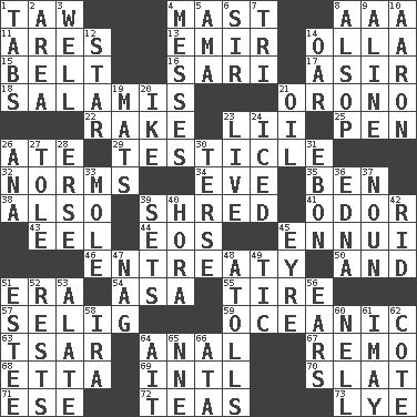 ACROSS 1. The 23rd letter of the Hebrew alphabet 4. Vertical spar for supporting sails 8. American Automobile Association (abbr.) 11. Ancient Greek god of war 13. Arab leader 14. Rounded earthenware pot or jar 15. Waist strap 16. Indian skirt 17. SW Saudi Arabia district 18. Deli grouping 21. U. of Maine site 22. Immoral or dissolute person 23. Cards in a Roman deck? 25. Writing instrument 26. Had dinner 29. One of the two male reproductive glands 32. Typical standards 34. Night before a holiday 35. Benjamin's nick name 38. In addition 39. Tear up 41. Scent 43. Snakelike fish 44. Greek goddess of the dawn 45. World-weariness 46. Plea 50. Also 51. Period 54. White ___ sheet 55. Hoop that covers a wheel 57. Major League Baseball Commissioner Bud 59. Pertaining to the sea 63. Russian ruler of old 64. Of or related to the anus 67. San ____ (Riviera town) 68. Singer James 69. International (abbr.) 70. Narrow board 71. Compass dir. 72. Afternoon social gatherings 73. Sodium hydroxide DOWN 1. Bar bills 2. Type of rug 3. Not ill 4. Makes clutter 5. Nursemaid (var.) 6. Title for a knight 7. Three (prefix) 8. Columnist Joseph or Stewart 9. Place in a line 10. Composer Copland 12. Play the lead 14. Rowing implement 19. Floor coverings 20. Mamie's husband 21. Petroleum 23. Moving, as bait 24. On the rocks 26. Santa ___, CA 27. Lacquered or enameled metalware 28. Celtic language 30. Laconic 31. Inky black, to poets 33. Undercover agent 36. Pulitzer Prize-winning author Ferber 37. Part of speech 39. Puts into a specified state 40. Israeli folk dance 42. To free from 45. Jane of fiction 47. Tired old horse 48. Ringlike coral islands and reefs 49. Nervous spasm 51. First name in cosmetics 52. Musical pauses 53. Having winglike extensions 56. Hearing organs 58. Lyricist Gershwin 60. 1994 drama film starring Jodie Foster 61. "If ____ say so..." 62. ____ d'Azur (French Riviera) 64. Small island 65. Compass dir. 66. _ moment's notice (2 wds.)