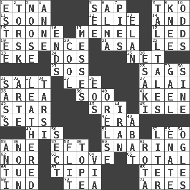 ACROSS 1. Inactive volcano in Sicily 5. Plant excrement 8. Ring climax 11. Within a short period 12. Writer Wiesel 14. Also 15. Marketplace scale 17. Klaipeda city 18. Directed 19. Center 21. White ___ sheet 22. French article 23. Supplement with great effort 24. Two (Sp.) 25. Fish or hair follower 27. Distress signal 28. Settles 31. Table seasoning 35. Area sheltered from the wind 37. Mountain range southwest of Kyrgyzstan 38. Length times width 39. "Barney Miller" actor Jack 41. Peachy ____! 42. Play the lead 43. _ Lanka 45. Capri or Wight 46. Arranges properly for use 47. Epoch 49. Part of HMS, perhaps 51. Experiment locale 52. Lion 55. One (Scot) 57. Newt 60. Catching in a trap 62. Or not 63. Garlic unit 65. "_____ Recall" 66. Third day of the wk. 67. Native american tent (variation) 68. Wig 69. Indiana (abbr.) 70. Afternoon social gathering 71. Ancient Greek god of war DOWN 1. First name in cosmetics 2. Cod relative 3. Trap for birds or small mammals 4. Singer Murray 5. Observe 6. _ mater 7. Sliced desserts 8. Baron Munchausen's specialties 9. Leg joint 10. Probability 13. Flair 16. Extremities 17. Makes clutter 20. Calm and collected 26. 1973 Nobel Price Winner (Physics) Leo 29. Highlander 30. Trig term 31. Backtalk 32. Johnson of "Laugh-In" 33. Resembling or made to resemble leather 34. Tarsus (plural) 36. Greek goddess of the dawn 40. Threatening words 44. SW Asia republic 48. Blind as ____ 50. Religious group 52. 61 cubic inches 53. Maternal 54. Stares 55. Opposed to 56. Part of speech 58. Sudden quick movement 59. Drink excessively 61. Roll call or roster of names 64. By way of