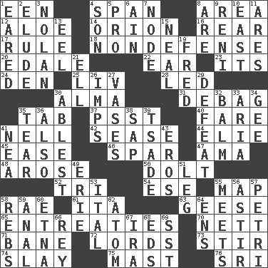 ACROSS 1. Car or cant ending 4. Connect, as a bridge 8. Type of rug 12. Medicinal plant 14. Greek mythologigal hunter 16. Hitchcock's "____ Window" 17. Court order 18. Unrelated to defense, as in spending 20. Peak District village in England 22. Ewer handle 23. ___ a Wonderful Life 24. Lair 25. 54 in ancient Rome 28. Directed 30. _ mater 31. Debunk (Brit. slang) 35. Keyboard key 37. Inconspicuous attention getter 40. Conductor's collection 41. 1994 drama film starring Jodie Foster 42. Gospel singer Marvin 44. Writer Wiesel 45. Comfort 46. Practice fight 47. Housemaid (var.) 48. Came up 50. Dunce 52. Three (prefix) 54. Compass dir. 55. Atlas unit 58. Actress Charlotte 61. Call ___ day 63. Honkers 65. Pleas 70. Remaining after all deductions 71. Object of repulsion 72. Nobles 73. Disorderly outburst 74. Kill 75. Vertical spar for supporting sails 76. _ Lanka DOWN 1. Having ears or earlike features 2. Evade 3. Pitcher Ryan 4. Boy, to dad 5. Adept person 6. The 18th letter of the Arabic alphabet 7. Connecting point 8. "We ___ not amused" (Victoria) 9. Painter Guido (1575-1642) 10. Compass direction 11. Ancient Greek god of war 13. Snakelike fish 15. Actress Patricia 19. Flintstone 21. Pipe bend 26. Naughty children 27. Flower holders 29. Outscore 30. Most capable 32. Lip ointment 33. Operatic vocal solo 34. Turn to the right 35. Rend 36. In addition 38. Plant excrement 39. Sadhe (variant) 41. Teachers' org. 43. Greek god of love 49. 4th largest of the Great Lakes 51. Part of a journey 53. Slanted text style (abbr.) 55. Confronts 56. Moving about 57. _ dish (used to culture cells) 58. Confederate soldiers (slang) 59. Of or related to the anus 60. Inactive volcano in Sicily 62. Tiny particle 64. Followers of ems 66. Marina Del _, California 67. Retirement account (abbr.) 68. Begley and Asner 69. Fast jet (abbr.)