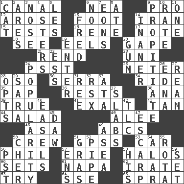 ACROSS 1. Lessep's creation 6. Teachers' org. 9. Adept person 12. Came up 13. Lowest support of a structure 14. SW Asia republic 15. Trials 16. French philosopher Descartes 17. Short letter 18. Perceive with the eye 19. Snakelike fish 20. Open wide 21. Tear apart 23. University (slang) 24. Inconspicuous attention getter 25. Distance measurement 28. Bear (Spanish) 30. Spanish missionary in California 34. Travel on or in a vehicle 35. Infant food 36. Musical pauses 38. Santa ___, CA 39. Loyal 41. Honor 43. Scottish cap 44. First course 46. Toward shelter 48. White ___ sheet 49. Lettered men learn these first 50. Group working together 51. Global Positioning Systems (abbr.) 53. Auto 56. Silvers or Donahue 57. One of the Great Lakes 58. Saint headwear 60. Arranges properly for use 61. California wine valley 62. Feeling or showing extreme anger 63. Attempt to accomplish something 64. Compass dir. 65. Small fatty European fish DOWN 1. Feline 2. Ancient Greek god of war 3. Characteristic smell of wine 4. Michaelmas daisies 5. French article 6. Christmas carol 7. Immeasurably long periods of time 8. Had dinner 9. Appease 10. Assign a rank or rating to 11. Single 13. Flintstone 14. More empty; more void 19. Keyboard key 20. Chewing product 22. Curvy letter 24. Teen's desire 26. Pulitzer Prize-winning author Ferber 27. 480, 500 or 516 sheets of paper 28. Elects 29. "Two Mules for Sister ____" 31. To sift 32. Acura sports coupe 33. "One Day ___ Time" 37. Thick slices 40. Artist's stands 42. Affectionate concern, for short 45. Simpleton 47. Fortification 49. At sea 50. "Mermaids" star 51. Pate de foie ____ 52. Corncob 54. Having or resembling wings 55. Round or rotation of duties 56. Pacific Standard Time (abbr.) 57. Followers of ems 58. Part of HMS, perhaps 59. Arrange properly for use