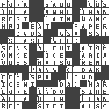 ACROSS 1. Tined utensil 5. Saudi Arabian king (1953-1964) 9. Music discs 12. The main thing one is thinking about 13. Queen of England 1702-14 14. SW Asia republic 15. Repose 16. (Had) reclined 17. Billionth: prefix 18. Medical imaging device (abbr.) 19. Consume 21. Some stationery 22. Movie discs 24. Girls' org. (abbr.) 26. Fast jet (abbr.) 27. Gospel singer Marvin 28. Downhill vehicle 29. Elected reps. 30. Native American of Southwest Alaska 32. Tiny particle 36. At one time in the past 37. Frozen water 38. Roberta Peters solo 39. Lyric poems 40. Taiwanese island in East China Sea 42. Monthly bill 43. Zero-star reviews 44. Covering 46. Opposite of masc. 49. Health resort 50. Grant temporary use of 51. Ancient Celtic tribe of eastern Britain 53. June honoree 54. Make imperfect 57. Old wives' tales, e.g. 58. Southeast Asian peninsula 61. Title for a man of rank and authority 62. Silent film actress Nazimova 63. It's straight from the horse's mouth 64. Liveliness 65. To separate or throw off 66. Proofreading order 67. In addition DOWN 1. Not soft or yielding to pressure 2. River in Europe 3. Home 4. Krazy ___ of comics 5. Table seasoning 6. Santa ___, CA 7. Corn or form start 8. Lair 9. Dice game 10. Natives or inhabitants of Denmark 11. Derisive sound 14. _ tizzy (2 wds.) 19. Begley and Asner 20. Toward the sea 21. Writing tablet 23. Flower holders 24. Adhesives 25. Put into a specified state 27. Transmit 28. Religious groups 29. "Barney Miller" actor Jack 31. Climbing, woody, usually tropical vines 32. Composer Copland 33. Excercise machine 34. Pig sound 35. Floor covering 40. Atlas unit 41. Southern CA. univ. 43. Air pressure measure (abbr.) 45. Directed 46. Of or pertaining to a thread or threads 47. Learning spot: Fr. 48. Haggard of country music 52. Teachers' org. 53. Do not 55. Ancient river in northeast Turkey 56. Former U.S. Attorney General Janet 58. Big collection agency 59. Fish or hair follower 60. Pass on 61. Ocean