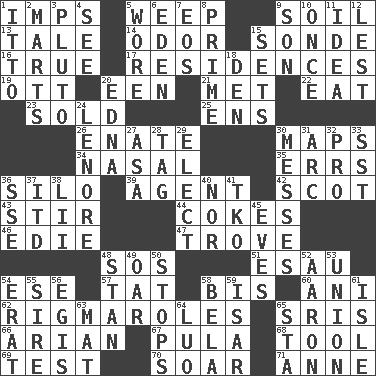 ACROSS 1. Naughty children 5. Shed a tear 9. The visible part of the earth's surface 13. Falsehood 14. Scent 15. Message 16. Loyal 17. Homes 19. Baseball player Mel 20. Car or cant ending 21. Was introduced to 22. Erode 23. Disposed of to a purchaser 25. Followers of ems 26. Maternal 30. Atlas contents 34. Relating to the nose 35. Blunders 36. Grain storage tower 39. Representative 42. Native of Scotland 43. Use a swizzle stick 44. Popular sodas 46. Singer Brickell 47. Collection of objects 48. Mayday 51. He sold his birthright 54. Compass dir. 57. Make lace 58. Twice 60. Black tropical American cuckoo 62. Complicated, petty procedures 65. Indian titles of respect 66. Believer in; advocate of (suffix) 67. Monetary unit of Botswana 68. Utensil 69. Trial 70. Fly high 71. Singer Murray DOWN 1. "Tell ____ the Marines!" 2. Shops 3. Mickey's pet 4. Perceive with the eye 5. Had on 6. Genesis locale 7. Greek goddess of the dawn 8. First class 9. Male child 10. Single time 11. The content of cognition 12. For fear that 15. Arranges properly for use 18. Lair 20. Pulitzer Prize-winning author Ferber 24. Poe poem 27. White ___ sheet 28. Label 29. Choose 30. Makes clutter 31. Curve 32. Adept person 33. Fast jet (abbr.) 36. Compass dir. 37. It would 38. Cards in a Roman deck? 40. Not either 41. Ring climax 45. Nights before holidays 48. Comedian Laurel of Laurel & Hardy 49. Boat paddle 50. Closes up, plugs up 52. Composer Copland 53. The state of being joined or united 54. Part of Q.E.F. 55. Father 56. The front part of a cuirass 58. Actor Lugosi 59. Austrian river, tributary to the Danube 61. Small island 63. Floor covering 64. Nilotic language 65. R.R. building