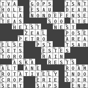 ACROSS 1. Federal power corp. 4. Republicans 8. Is not 12. Opening into or through something 14. He sold his birthright 15. Letter starter 16. Silent film actress Nazimova 17. Unrelated to defense, as in spending 20. Afternoon social gatherings 21. "Barney Miller" actor Jack 22. Had dinner 23. Robbery 27. Egg locale 29. Ardor 31. Introduce or present, as a question 34. Stone: prefix 35. Type of rug 36. Otherwise 39. 23rd letter of the Greek alphabet 41. Russian ruler of old 42. Arranges properly for use 43. _____ Park, CO 46. "Corrida" creature 47. Water falling in drops from the sky 48. "____ silly question..." 51. Musical pauses 54. The first octave above the treble staff 56. One (Scot) 58. Wander aimlessly 61. Rotating or pertaining to rotation 66. Southeast Asian peninsula 67. Riding implement 68. One of the Great Lakes 69. River in Europe 70. Posted 71. Plant excrements 72. Compass dir. DOWN 1. Not this but _ 2. Short-tailed, large-bodied rat 3. Assad's deity 4. Commissioned mil. rank 5. Bear (Spanish) 6. Baking dish 7. Beer foam 8. Binary compound 9. Legislators 10. Political cartoonist Thomas 11. Relationship diagram 13. Relaxation 18. A really long time 19. Enemy 24. Ending with capital 25. Put into a specified state 26. Canvas cover 28. Arguments over trivial matters 30. Failure 32. Ocean 33. Hearing organ 34. Mexican monetary units 36. Eastern Standard Time (abbr.) 37. Lion 38. Ski resort town in Vermont 40. Austrian river, tributary to the Danube 44. Standoff 45. Followers of ems 49. Krazy ___ of comics 50. Black tropical American cuckoo 52. Musical group of three 53. Something which is sent 54. Curves 55. Old wives' tales, e.g. 57. Nights before holidays 59. Arabian gulf 60. Greater amount 62. Fitting 63. Period 64. Mouth edge 65. It is so