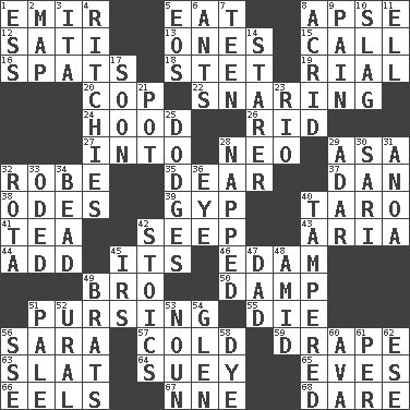 ACROSS 1. Arab leader 5. Consume 8. Domed church section 12. Suttee (variant) 13. Singles 15. Give a ring to 16. Arguments over trivial matters 18. Proofreading order 19. Monetary unit of Yemen 20. Police officer (slang) 22. Catching in a trap 24. Parka part 26. To free from 27. To the inside or interior of 28. Modern: prefix 29. White ___ sheet 32. Loose flowing garment 35. Letter starter 37. Daniel's nick name 38. Lyric poems 39. Swindle 40. Edible starchy tuberous root 41. Beverage made from leaves 42. Ooze 43. Operatic vocal solo 44. Find the sum of 45. It is 46. Dutch treat 49. Sis' sibling 50. Moist 51. Puckering 55. Expire 56. "Two Mules for Sister ____" 57. Chilled 59. Window treatment 63. Narrow board 64. Chop _ 65. Nights before holidays 66. Snakelike fish 67. Compass dir. 68. Have the gumption DOWN 1. Curvy letter 2. Atlas unit 3. Call ___ day 4. Actors Guy, Robert Welles, and Clint 5. Greek goddess of the dawn 6. Pismires 7. Adolescent 8. Bitter 9. Ache 10. Volcanic refuse 11. Pipe bend 14. A viewer who gazes fixedly 17. Within a short period 21. Plant holder 23. _ de Janeiro 25. Evades 28. Slept 29. The sixth month of the Jewish calendar 30. Indian skirt 31. Small Philippine buffalo 32. Round or rotation of duties 33. Wrote a lyric poem 34. Necklace unit 36. Sight organ 40. ________ with (broke a safety seal) 42. Unemotional ones 45. Big collection agency 47. Male parent 48. Among 49. Naughty children 51. Light colored 52. Mountain range 53. Part of speech 54. Small, secluded valley 56. Compass dir. 58. Color 60. Actress Gardner 61. For each 62. Compass dir.