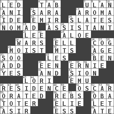 ACROSS 1. Directed 4. Bar bill 7. ____ Bator 11. Cuckoo 12. "Two Mules for Sister ____" 13. Odor 14. Binary compound 15. Independent ruler or chieftain 16. Chalkboards 17. Wanderer 19. Aide 21. Area sheltered from the wind 23. Medicinal plant 24. Armed conflicts 25. Pipe bend 26. Gear tooth 29. Damp 30. Mountains (abbr.) 31. Grow older 32. "Barney Miller" actor Jack 33. French article 34. Benjamin's nick name 35. Say or write further 36. Car or cant ending 37. Bert's buddy 40. It is so 41. Plus 42. The Jewish people; Israel 43. Australian parrot (variant) 45. Australian flightless bird 46. Dwelling 51. Witty Wilde 55. Declaimed 56. Confederate soldiers (slang) 58. Chief or king in Benin or Nigeria 59. Carrier 60. Writer Wiesel 61. Allow 62. SW Saudi Arabia district 63. Double-curved letter 64. Had dinner DOWN 1. (Had) reclined 2. Inside; within (prefix) 3. South Vietnam president (1954) 4. Scottish cap 5. Operatic vocal solo 6. Long, evenly shaped pieces 7. A salt of uric acid 8. Globular water bottle used in Asia 9. So be it 10. Political cartoonist Thomas 12. Spring feasts 13. In addition 16. Beverly of Met fame 18. Jai ____ 20. Table seasonings 22. Eastern Standard Time (abbr.) 24. Forest 25. Make improvements or corrections to 26. Apartment or room in a ship 27. Double curve, resembling the letter S 28. Commissioned military rank (abbr.) 29. Method 32. Declare 33. Soviet premier 1918-24 36. Having ears or earlike features 37. Compass dir. 38. Full of chinks, cracks, or crevices 39. Common sense 43. 61 cubic inches 44. Baltic tributary 46. Roll call or roster of names 47. Greek god of love 48. Suttee (variant) 49. Algonquian 50. Snakelike fish 52. Root beer relative 53. Collude with 54. Pace 57. Altar cloth linen