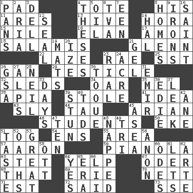 ACROSS 1. Writing tablet 4. Carry 8. Part of HMS, perhaps 11. Ancient Greek god of war 13. Hub of activity 14. Israeli folk dance 15. "Death on the ____" 16. Liveliness 17. Mine, in Marseilles 18. Deli grouping 21. American astronaut and politician John 22. Goldbrick 23. Actress Charlotte 25. Fast jet (abbr.) 26. Separate the seeds from cotton 29. A testis 32. Bobsleighs 34. Boat paddle 35. Cartoonist voice _ Blanc 38. Capital of Western Samoa 39. Took without asking 41. The content of cognition 43. Playfully artful 44. The 19th letter of the Greek alphabet 45. Believer in; advocate of (suffix) 46. SAT takers 50. Make supply last 51. Coat; cloak 54. Followers of ems 55. Length times width 57. Composer Copland 59. Player piano 63. Proofreading order 64. Sharp bark 67. Baltic tributary 68. Not this but _ 69. 4th largest of the Great Lakes 70. Remaining after all deductions 71. Eastern Standard Time (abbr.) 72. Expressed in words 73. Compass dir. DOWN 1. Zero-star reviews 2. Roberta Peters solo 3. Small valley 4. College papers 5. Lubricate 6. Federal power corp. 7. Car or cant ending 8. Dwellings 9. Metal shackles 10. Virtuous person 12. Lick closed 14. Actor Linden 19. Floor protectors 20. Ending with capital 21. Set 23. Monetary unit of Yemen 24. Measure of real estate 26. Girls' org. (abbr.) 27. High mountains 28. Famous astronaut Armstrong 30. Woman's close-fitting hat 31. Arab leader 33. 24-hour periods 36. Singer Brickell 37. Path through which fluid escapes 39. Astound 40. Small boys 42. A saturated hydrocarbon 45. At sea 47. "___ Little Indians" 48. Slept 49. Three (prefix) 51. Clothes sense 52. Expletives 53. Relatively large 56. At once, immediately (arch.) 58. Baseball player Mel 60. Lyric poems 61. Allows 62. Johnson of "Laugh-In" 64. Affirmative reply 65. Epoch 66. Cards in a Roman deck?