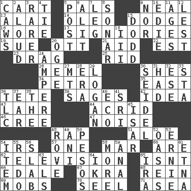ACROSS 1. Draw slowly or heavily 5. Friends 9. Actress Patricia 13. Jai _ 14. Margarine 15. Evade 16. Had on 17. Seigniories (variant) 19. Take to court 20. Baseball player Mel 21. Help 22. Eastern Standard Time (abbr.) 23. To draw with force 25. To free from 26. Klaipeda city 30. "______ My Girl" (Turtles hit) 34. Stone: prefix 35. 90 degrees 36. Wig 39. Gurus 42. The main thing one is thinking about 43. Cowardly lion portrayer 44. Sour-tasting 46. Algonquian 47. Annoying sound 48. Strike 51. _ vera 54. Big collection agency 57. Single 58. Spoil 60. "We ___ not amused" (Victoria) 62. Household entertainment appliance 65. Is not 66. Peak District village in England 67. Gumbo ingredient 68. It's straight from the horse's mouth 69. Disorderly crowds 70. Sew up the eyelids of hawks and falcons 71. At sea DOWN 1. Crow sounds 2. Verbally 3. More uncommon 4. Neckwear 5. Mail 6. Set down 7. Part of a journey 8. Echolocation 9. And not 10. Singer Brickell 11. Matures 12. For fear that 15. Texas town _ City 18. One more than two 20. Double curve, resembling the letter S 24. Electrical Unit 27. Mountains (abbr.) 28. Period 29. Utah city north of Ogden 30. Beer mug 31. Possessed 32. Compass dir. 33. R.R. building 36. Affectionate concern, for short 37. Hearing organ 38. Definite Article 40. Environmental prefix 41. _ Lanka 45. Austrian river, tributary to the Danube 48. Be footloose 49. Cuckoo 50. Mexican monetary units 52. Fertile tracts in a desert 53. Bert's buddy 54. A whole individual unit 55. Do over again 56. Thick slice 58. Greater amount 59. Of or related to the anus 61. Inactive volcano in Sicily 63. Raised railways 64. Mamie's husband 65. Lyricist Gershwin