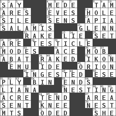 ACROSS 1. Declare 4. Ancient Persian 8. Scottish cap 11. Ancient Greek god of war 13. Nights before holidays 14. Hollow 15. Drop; flow; fall 16. Elected reps. 17. Capital of Western Samoa 18. Deli grouping 21. American astronaut and politician John 22. Immoral or dissolute person 23. Falsehood 25. Put into a specified state 26. "We ___ not amused" (Victoria) 29. One of the two male reproductive glands 32. Methods 34. Adept person 35. Crowd into 38. Blind as ____ 39. Moved through 41. Picture 43. Australian flightless bird 44. Binary compound 45. Constellation of myth 46. Consumed 50. Compass dir. 51. Travel a route regularly 54. Storage container 55. Extremities 57. Climbing, woody, usually tropical vines 59. Snuggling 63. Measure of real estate 64. Watch over 67. Length times width 68. Emitted 69. Leg joint 70. Egg locale 71. Mountains (abbr.) 72. Wrote a lyric poem 73. A female animal or person DOWN 1. Backtalk 2. Roberta Peters solo 3. Shout 4. Makes clutter 5. First lady 6. Lair 7. Double-curved letter 8. Drinks excessively 9. Place in a line 10. Intended 12. Burn superficially 14. Actor Linden 19. Floor coverings 20. Mamie's mate 21. Set 23. Louse (plural) 24. On the rocks 26. Nursemaid (var.) 27. Loose flowing garment 28. Dutch treat 30. Receives possession of 31. Independent ruler or chieftain 33. Needle case 36. Migrant worker of the '30s 37. Scornful sounds 39. Swiss mountan, "Queen of the Mountains" 40. Arabian gulf 42. Compass dir. 45. Probability 47. Basketball assoc. 48. Watched over 49. Compass dir. 51. Suffix with ecto or cyto 52. It is permitted: Lat. 53. Tall tales 56. Comedian Laurel of Laurel & Hardy 58. Fish or hair follower 60. Angers 61. Delicate 62. Yard entry 64. Ring climax 65. Conclusion 66. Born