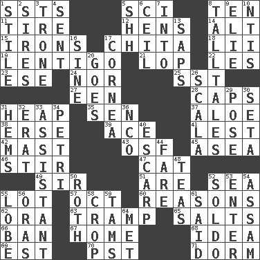 ACROSS 1. Fast planes 5. _-fi 8. Nine, plus one 11. Hoop that covers a wheel 12. Coop moms 14. The first octave above the treble staff 15. Metal shackles 17. Riviera of "Kiss of the Spider Woman" 18. Cards in a Roman deck? 19. Small, flat, pigmented spot on the skin 21. Trim (branches) 22. French article 23. Compass dir. 24. Or not 25. Fast jet (abbr.) 27. Car or cant ending 28. Smile enhancers 31. Pile 35. Elected rep. 37. _ vera 38. Celtic language 39. Adept person 41. For fear that 42. Vertical spar for supporting sails 43. Order of Saint Francis (abbr.) 45. Toward the sea 46. Tumult 47. Feline 49. Title for a knight 51. "We ___ not amused" (Victoria) 52. Ocean 55. Car dealer's back yard 57. Sep. follower 60. Thinks logically 62. Mouth or opening 63. _____ steamer (cargo ship) 65. Table seasonings 66. Prohibit 67. Residence 68. It may be bright or harebrained 69. Eastern Standard Time (abbr.) 70. Pacific Standard Time (abbr.) 71. Dormintory (informal) DOWN 1. Vertical member of a panel or frame 2. Founders of families 3. Marketplace scale 4. Transmitted 5. Quiet! 6. To provide with a ceiling 7. To the inside or interior of 8. Baron Munchausen's specialties 9. Writer Wiesel 10. Nuclear Threat Initiatives 13. Plant excrements 16. Trig term 17. Pupil covering 20. Travels 26. Any of the three canals of the cochlea 29. Introduce or present, as a question 30. Bristle 31. Cloth borders 32. Part of Q.E.F. 33. Helper 34. _ dish (used to culture cells) 36. Non-commissioned officer (abbr.) 40. Fortification 44. Conductor's collection 48. Beverages made from leaves 50. Writer of Portnoy's Complaint (1969) 52. Twentieth part of a lira 53. Keyboard key 54. Indian state 55. Ear part 56. Mouths or openings 58. Riding implement 59. Scottish caps 61. Expressed in words 64. Was introduced to