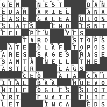 ACROSS 1. Commissioned mil. rank 4. A home for chicks 8. Daniel's nick name 11. Dutch treat 13. Satellite of Uranus 15. Santa ___, CA 16. Relaxation 17. An organ shaped like a helmet 18. "Vaya con ____" 19. Narrow boards 21. Conclude 22. Is not 23. Snakelike fish 24. Animal enclosure 27. It is so 29. Edible starchy tuberous root 30. Ceases 34. Had dinner 36. Norwegian king 39. Traditional theme or motif 40. Ancient Greek god of war 41. Gurus 43. To erase 44. Before Barbara or Clara 46. 1994 drama film starring Jodie Foster 47. Definite Article 48. Moving about 49. Straggles 51. Corporate head (abbr.) 53. _ moment's notice (2 wds.) 54. Domesticated feline 57. Slanted text style (abbr.) 60. Sound made by sheep 63. New (sp.) 65. Mediterranean tributary 66. Stares 69. Groove 70. Three (prefix) 71. Related on the mother's side 72. Writer Wiesel 73. Allow 74. South American Indian 75. Begley and Asner DOWN 1. Honkers 2. Peak District village in England 3. Relating to the nose 4. Tired old horse 5. Period 6. Filth; sediment 7. Adolescent 8. Raised platform 9. At once, immediately (arch.) 10. Political cartoonist Thomas 12. Was introduced to 14. Kenny Rogers chart-topper in '80 18. What propaganda does 20. Health resort 25. Greek god of love 26. Pitcher Ryan 28. Eastern Standard Time (abbr.) 29. One of the two male reproductive glands 31. Brightly colored fish 32. Introduce or present, as a question 33. Compass dir. 34. Caspian sea tributary 35. Portable shelter 37. Grow older 38. Chap (slang) 40. White ___ sheet 42. Narrow board 45. "We ___ not amused" (Victoria) 50. Separate the seeds from cotton 52. Mitch Miller's instrument 54. Cell (Danish) 55. Shun 56. Lugs 57. International (abbr.) 58. Hoop that covers a wheel 59. Set down 61. Hindu god of fire 62. ____ Jay Lerner 64. Purpose 67. And so on (abbr.) 68. Ocean