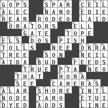 ACROSS 1. Republicans 5. Practice fight 9. To provide with a ceiling 13. Actor Baldwin 14. Billionth: prefix 15. Singer Brickell 16. Rump 17. Cowboy competition 18. Put down 19. Speakers 21. Pipe bend 22. Yard entry 23. Drink excessively 24. Raised railways 27. Two (Sp.) 28. Expression of disdain 29. For Whom the Bell _____ 31. Born 32. Gumbo ingredient 36. Woody plant 37. Male offspring 38. Famous astronaut Armstrong 39. Opera by Verdi 40. Partially opened flower 41. Gives food to 42. Loyal 44. Parent Teacher Association (abbr.) 46. Modern: prefix 47. Not this but _ 48. Israeli folk dance 50. Perceive with the eye 51. Devices for capturing images 54. Having or resembling wings 56. Dinah or Pauly 58. International (abbr.) 60. Thickened enlargement 61. Edible starchy tuberous root 62. Needle case 63. Colored 64. Sums up 65. Actor's bit DOWN 1. Slender fish 2. Butter sub 3. Lightbulb-shaped fruit 4. Lean end of the neck 5. Sounds asleep 6. Groovy apts. 7. One (Scot) 8. Friend of Pooh 9. Portable communications device 10. Peak District village in England 11. One more than two 12. Directed 17. Printing process, for short 20. Small amounts or degrees 21. Greek goddess of the dawn 23. Standoff 24. Singer James 25. Australian parrot (variant) 26. Downhill vehicle 28. Fenced enclosure 30. Tough but pliablecoriaceous 31. Lower and raise head in agreement 33. Peachy ____! 34. Travel on an animal 35. In addition 37. Institute legal proceedings 40. Yet 41. Conductor's collection 43. Actress Charlotte 44. N Egypt peninsula 45. Heavy book 47. Sadhe (variant) 49. Satellite of Uranus 51. Drawstring 52. Against 53. Astound 54. Also 55. Myrna of the movies 56. R.R. building 57. Possessed 59. Whopper