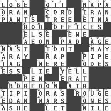 ACROSS 1. Ear part 5. Baseball player Mel 8. California wine valley 12. NW Algerian seaport 13. Drawstring 15. SW Asia republic 16. Leg coverings 18. Relationship diagram 19. Inactive volcano in Sicily 20. Friend of Pooh 22. Public positions 24. Otherwise 26. Compass dir. 27. Period of immesurable duration 28. Writing tablet 29. Ripen 32. Political cartoonist Thomas 35. A blast of a horn 37. Fifth month 38. Like ___ of sunshine 39. Hit sharply and swiftly 40. Corncob 41. Label 42. We are 43. Lyric poems 44. Double-curved letter 45. Untruth 46. Shout 49. Animal enclosure 50. Part of Q.E.F. 51. Mood resulting from idleness 55. Wind 56. Native american tent (variation) 57. Mouths or openings 59. Makeup applied to the cheeks 63. Dutch treat 64. Armed conflicts 65. Singles 66. American tennis player Robert 67. Allow 68. The longest river in the world DOWN 1. Trim (branches) 2. Mouth or opening 3. Forbid 4. Plea 5. Sep. follower 6. "Corrida" creature 7. Not kosher 8. Sibling's daughter 9. Johnson of "Laugh-In" 10. Baking dishes 11. Santa ___, CA 14. Outscore 17. Flatfish 21. Bear (Spanish) 23. Working for oneself (abbr.) 25. Main course 28. Wimpy's pal 29. Among 30. Open wide 31. Sight organs 32. Nathan's nickname 33. Ancient river in northeast Turkey 34. Sinks 36. Boat paddle 40. Coward 42. Light entry point 45. Area sheltered from the wind 47. Epoch 48. Den 49. First class 51. Auction offers 52. Brightly colored fish 53. Taken by mouth 54. Female horse 56. Beverage made from leaves 58. Fast jet (abbr.) 60. Single; one (prefix) 61. Set 62. Compass dir.