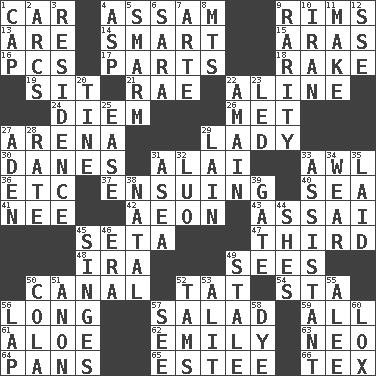 ACROSS 1. Auto 4. Indian state 9. Basketball hoops 13. "We ___ not amused" (Victoria) 14. Don Adams' spy role 15. Ancient river in northeast Turkey 16. Personal Computers (abbr.) 17. Components 18. Immoral or dissolute person 19. Be seated 21. Actress Charlotte 22. Place in a line 24. South Vietnam president (1954) 26. Was introduced to 27. Sports stadium 29. Kenny Rogers chart-topper in '80 30. Natives or inhabitants of Denmark 31. Jai ____ 33. Leather borer 36. And so on (abbr.) 37. Taking place subsequently 40. Ocean 41. Born 42. A really long time 43. Slender Brazilian palm 45. Stalk of a moss capsule 47. One of three equal parts 48. Lyricist Gershwin 49. Perceives with the eye 50. Lessep's creation 52. Make lace 54. R.R. building 56. Protracted 57. First course 59. Everything 61. Medicinal plant 62. Poet Dickinson 63. Modern: prefix 64. Zero-star reviews 65. First name in cosmetics 66. John Ritter's dad DOWN 1. Head covering 2. Arches 3. Home 4. Viper 5. Excessive but superficial compliments 6. "Two Mules for Sister ____" 7. Johnson of "Laugh-In" 8. Mountains (abbr.) 9. Noteworthy scarcity 10. SW Asia republic 11. Cause to be 12. Compass dir. 20. Prong on a fork 22. With great haste 23. Directed 25. Comfort 27. An important port of Yemen 28. Pace 29. (Had) reclined 31. Toward the sea 32. Nilotic language 33. Helper 34. Put on (as clothing) 35. Put down 38. Brizilian seaport 39. Yard entry 44. "______ My Girl" (Turtles hit) 45. Burns superficially 46. Epoch 49. Showing deterioration from age 50. Root beer relative 51. Soon (poet.) 52. Scottish caps 53. Came down and settled, as after flight 55. Toward shelter 56. Pet locale 57. Perceive with the eye 58. Color 60. Brine-cured salmon
