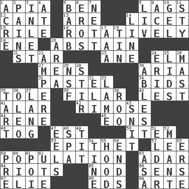 ACROSS 1. Capital of Western Samoa 5. Benjamin's nick name 8. Falls behind 12. Patter 13. "We ___ not amused" (Victoria) 14. It is permitted: Lat. 15. Cause heat under the collar 16. Happening in regular succession 19. Compass dir. 20. Choose not to consume 21. Play the lead 23. One (Scot) 24. Shade tree 27. Not women's 30. Operatic vocal solo 31. Soft color 34. Auction offers 35. Lacquered or enameled metalware 38. Of or pertaining to a thread or threads 40. For fear that 41. Having or resembling wings 42. Full of chinks, cracks, or crevices 44. French philosopher Descartes 45. Immeasurably long periods of time 46. Coat; cloak 47. Eastern Standard Time (abbr.) 50. A distinct part 53. Curse 57. Area sheltered from the wind 59. Census information 63. The sixth month of the Jewish calendar 64. Debaucheries 65. Lower and raise head in agreement 66. Elected reps. 67. Writer Wiesel 68. Begley and Asner 69. Johnson of "Laugh-In" DOWN 1. 43,560 square feet 2. Aches 3. An arm off of a larger body of water 4. Had dinner 5. Sharp remark 6. Greek god of love 7. Remaining after all deductions 8. 54 in ancient Rome 9. Adept person 10. Set 11. Filthy place 14. Actor's bit 17. Auto club (abbr.) 18. Metal container 20. Type of rug 22. Electrical Unit 24. 4th largest of the Great Lakes 25. Flaplike coverings 26. Vertical spar for supporting sails 28. Science/research agcy. 29. Tumult 30. Most capable 32. Biblical high priest 33. Unable to walk 35. Small pie 36. Margarine 37. Austrian-born American filmmaker Fritz 39. Friend of Pooh 43. In a ____ (agitated or irritated) 47. Snakelike fish 48. Health resort 49. Teat (slang) 51. A person who is older than you are 52. Intended 54. Prong on a fork 55. Parka part 56. Extremities 58. Celtic language 59. Before (prefix) 60. Petroleum 61. Luau course 62. Shoshoni 63. White ___ sheet