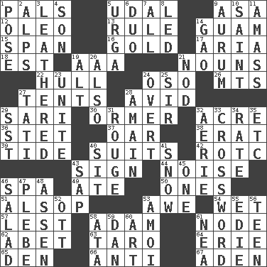 ACROSS 1. Friends 5. Hereditary estate 9. White ___ sheet 12. Butter sub 13. Court order 14. Island territory of the United States 15. Connect, as a bridge 16. Precious metal 17. Operatic vocal solo 18. Eastern Standard Time (abbr.) 19. Auto club (abbr.) 21. Parts of speech 22. Frame or body of a ship 24. Bear (Spanish) 26. Mountains (abbr.) 27. Portable shelters 28. Enthusiastic 29. Indian skirt 30. Abalone 32. 43,560 square feet 36. Proofreading order 37. Rowing implement 38. Part of Q.E.F. 39. Periodic rise and fall of the sea level 40. Costumes for special activities 42. College mil. group 43. Signal 44. Annoying sound 46. Health resort 49. Had dinner 50. Washington bills 51. Columnist Joseph or Stewart 53. Deep reverence 54. Soggy 57. For fear that 58. First man 61. Connecting point 62. Collude with 63. Pacific island yam 64. One of the Great Lakes 65. Lair 66. Against 67. An important port of Yemen DOWN 1. Introduce or present, as a question 2. High mountains 3. Resembling or made to resemble leather 4. Boy, to dad 5. Capital and largest city of Mongolia 6. Superhero pair 7. 100% 8. Directed 9. Gold (Symbol: Au) 10. Inhabitant of Heaven 11. Collect or gather 14. E Mali city 19. Keyboard modifier key 20. In addition 21. Dreamland 23. Join together 24. Unconcealed 25. Title for a knight 27. Jacques of French films 28. At full speed 29. Fast jet (abbr.) 31. Makeup applied to the cheeks 32. Nest on high 33. What you're doing now 34. Pace 35. And so on (abbr.) 40. Be seated 41. Frozen precipitation 43. Plant excrement 45. Single 46. Vegetable dish 47. First-year military academy student 48. NE Netherlands city 52. Baseball player Mel 53. Mine, in Marseilles 55. Singer Brickell 56. Adolescent 58. _ moment's notice (2 wds.) 59. One of the 12 tribes of Israel 60. Nonscientific branch of learning 61. Teachers' org.
