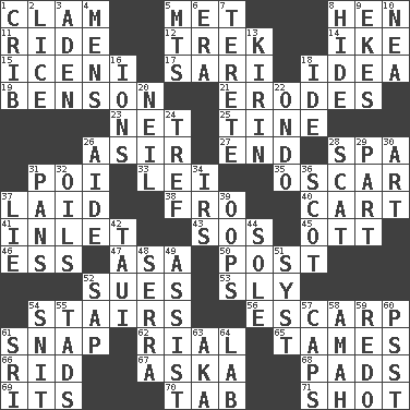 ACROSS 1. Dollar (slang) 5. Was introduced to 8. Layer 11. Travel on or in a vehicle 12. Long journey 14. Mamie's mate 15. Ancient Celtic tribe of eastern Britain 17. Indian skirt 18. The main thing one is thinking about 19. Gillaume's butler role 21. Eats (away) 23. Fish or hair follower 25. Prong on a fork 26. SW Saudi Arabia district 27. Conclude 28. Health resort 31. Luau course 33. Luau accessory 35. Witty Wilde 37. Put down 38. From 40. Draw slowly or heavily 41. An arm off of a larger body of water 43. Mayday 45. Baseball player Mel 46. Curvy letter 47. White ___ sheet 50. Mail 52. Takes to court 53. Wily 54. Flight of steps 56. Fortification 61. Fastener 62. Monetary unit of Yemen 65. Softens 66. To free from 67. "____ silly question..." 68. Writing tablets 69. ___ a Wonderful Life 70. Keyboard key 71. Attempt DOWN 1. Baby bed with high sides 2. Louse (plural) 3. An important port of Yemen 4. Not women's 5. Mountains (abbr.) 6. Period 7. Cigar-shaped 8. Flintstone garb 9. Supplements with great effort 10. Teachers' org. 13. Japanese brewing company 16. Charged particles 18. Binary compound 20. Famous astronaut Armstrong 22. Southwest Nigerian state 24. Not kosher 26. Helper 28. Go away! 29. Piece 30. Tate display 31. Baking dishes 32. Lubricates 34. Big collection agency 36. Native of Scotland 37. Untruth 39. I made a mistake 42. "Change" in Tahitian 44. Flatfish 48. Father Junipero _ 49. Help 51. System (abbr.) 52. Plant excrement 54. In a ____ (agitated or irritated) 55. Small amounts or degrees 57. Smile enhancers 58. Wet nurse 59. Make new 60. Inconspicuous attention getter 61. Indian title of respect (Mr.) 63. Alias (abbr.) 64. Experiment locale