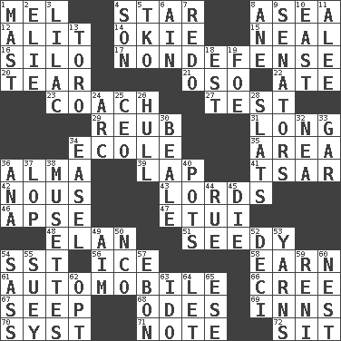 ACROSS 1. Cartoonist voice _ Blanc 4. Play the lead 8. At sea 12. Came down and settled, as after flight 14. Migrant worker of the '30s 15. Be tempered by heat 16. Grain storage tower 17. Unrelated to defense, as in spending 20. Pull apart 21. Bear (Spanish) 22. Had dinner 23. Team commander 27. Trial 29. Reuben's nickname 31. Having great length 34. Learning spot: Fr. 35. Type of rug 36. _ mater 39. Pet locale 41. Russian ruler of old 42. Good sense 43. Domineers 46. Domed church section 47. Needle case 48. Enthusiasm 51. Morally degraded 54. Fast jet (abbr.) 56. Frozen water 58. Merit 61. Form of transportation 66. Algonquian 67. Ooze 68. Lyric poems 69. Restaurants 70. System (abbr.) 71. Musical sound 72. Be seated DOWN 1. Vertical spar for supporting sails 2. Writer Wiesel 3. Pale purple color 4. Male child 5. Ring climax 6. The 18th letter of the Arabic alphabet 7. Redecorate 8. One (Scot) 9. Legislators 10. Compass direction 11. Toward shelter 13. "Corrida" creature 18. Eastern Standard Time (abbr.) 19. Enemy 24. Curve 25. Corporate head (abbr.) 26. Frame or body of a ship 28. Narrow boards 30. Calif. Air Force Base 32. Teachers' org. 33. Slender fish 34. Artist's stand 36. Santa ___, CA 37. Trim (branches) 38. French bagpipes 40. Plant holders 44. Regret 45. Expire 49. Direct toward a target or goal 50. Non-commissioned officer (abbr.) 52. Tenth: prefix 53. Entertaining tales 54. Backtalk 55. Chop _ 57. Inky black, to poets 59. Painter Guido (1575-1642) 60. Egg locale 62. Elect 63. Wedding promise 64. Allow 65. Compass dir.