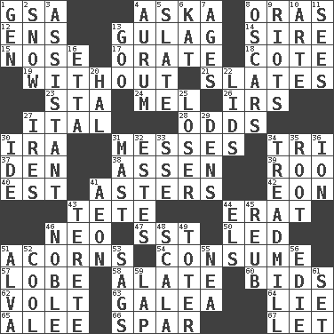 ACROSS 1. Girls' org. (abbr.) 4. "____ silly question..." 8. Mouths or openings 12. Followers of ems 13. POW camp 14. Father 15. Sense of smell 17. Declaim 18. ____ d'Azur (French Riviera) 19. Sans 21. Chalkboards 23. R.R. building 24. Cartoonist voice _ Blanc 26. Big collection agency 27. Slanted text style (abbr.) 28. Probability 30. Retirement account (abbr.) 31. Makes clutter 34. Three (prefix) 37. Lair 38. NE Netherlands city 39. Friend of Pooh 40. Eastern Standard Time (abbr.) 41. Michaelmas daisies 42. Age 43. False hair 44. Part of Q.E.F. 46. Modern: prefix 47. Fast jet (abbr.) 50. Directed 51. Oak nuts 54. Eat 57. Ear part 58. Having winglike extensions 60. Auction offers 62. Electrical Unit 63. An organ shaped like a helmet 64. Falsehood 65. Toward shelter 66. Practice fight 67. Allow DOWN 1. Commissioned military rank (abbr.) 2. Overwhelm 3. Aide 4. Gold (Symbol: Au) 5. Schedule 6. Krazy ___ of comics 7. Matures 8. Motion picture awards 9. Debaucheries 10. Johnson of "Laugh-In" 11. Perceives with the eye 13. Thick or sticky substance 16. Singer James 20. Actor Linden 22. Hats (slang) 25. Failure 27. Angers 29. Hiding places for outlaws 30. Binary compound 31. Vertical spar for supporting sails 32. _____ Park, CO 33. Compass dir. 34. Excercise machine 35. Carrot, for example 36. Electrically charged atom 41. A really long time 43. Cigar-shaped 44. Raised railways 45. Reuben's nickname 46. Having high moral qualities 48. Any of the three canals of the cochlea 49. Carrier 51. Inventor's middle name 52. Calm and collected 53. Settles 55. Teachers' org. 56. Singer Brickell 59. Pet locale 61. Arrange properly for use