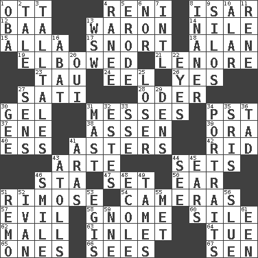 ACROSS 1. Baseball player Mel 4. Painter Guido (1575-1642) 8. Austrian river, tributary to the Danube 12. Sound made by sheep 13. Make _____ (do battle with) 14. The longest river in the world 15. Silent film actress Nazimova 17. Derisive sound 18. ____ Jay Lerner 19. Shoved, as through a crowd 21. Poe poem 23. The 19th letter of the Greek alphabet 24. Snakelike fish 26. It is so 27. Suttee (variant) 28. Baltic tributary 30. Set 31. Makes clutter 34. Pacific Standard Time (abbr.) 37. Compass dir. 38. NE Netherlands city 39. Mouth or opening 40. Curvy letter 41. Michaelmas daisies 42. To free from 43. Johnson of "Laugh-In" 44. Puts into a specified state 46. R.R. building 47. Put into a specified state 50. Ewer handle 51. Full of chinks, cracks, or crevices 54. Devices for capturing images 57. Tending to cause great harm 58. Dwarf 60. Drop; flow; fall 62. Promenade 63. An arm off of a larger body of water 64. Third day of the wk. 65. Washington bills 66. Perceives with the eye 67. Elected rep. DOWN 1. Chief or king in Benin or Nigeria 2. Story 3. Baron Munchausen's specialties 4. The wife of a rajah (variant) 5. Eat (away) 6. And not 7. International (abbr.) 8. More lacking in sense or substance 9. Grain storage towers 10. Having or resembling wings 11. French philosopher Descartes 13. Compass dir. 16. Blind as ____ 20. Fr. "Yes" 22. Snake ____ (dice throw) 25. Failure 27. Elected reps. 29. Lairs 30. Unit of force equal to gravity 31. Vertical spar for supporting sails 32. _____ Park, CO 33. Compass dir. 34. Likenesses of persons 35. Indian titles of respect 36. Small amount or degree 41. Caspian sea tributary 43. Ringlike coral islands and reefs 44. Observe 45. Hearing organs 46. Grin 48. Learning spot: Fr. 49. Corrects by punishment or discipline 51. San ____ (Riviera town) 52. _ the terrible 53. The front part of a cuirass 55. Was introduced to 56. Turn sharply 59. Compass dir. 61. Car or cant ending