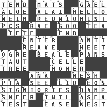 ACROSS 1. Look after 5. Floor protectors 9. Highlander 13. Medicinal plant 14. Jai _ 15. Phone greeting 16. Count _ (2 wds.) 17. One who advocates reunion 19. Personal Computers (abbr.) 20. Actress Charlotte 21. Thick or sticky substance 22. Afternoon social gathering 23. Wig 25. Conclude 26. Keyboard key 30. Against 34. Break or tear apart 35. Rendezvous 36. Legendary monster 39. Memphis, Tenn. Street 42. Baking dishes 43. Pulled tight 44. Cell (Danish) 46. Woody plant 47. Baseball hit which scores a run 48. Santa ___, CA 51. Delicate 54. Parent Teacher Assoc. 57. Observe 58. Hat (slang) 60. Greek goddess of the dawn 62. Seigniories (variant) 65. Moist 66. Scornful expression 67. International (abbr.) 68. At sea 69. Trial 70. Relaxation 71. Compass direction DOWN 1. Pack (down) 2. Voters do this 3. Annoying sound 4. Lair 5. Hindu Mythology: god of death 6. Toward shelter 7. The 19th letter of the Greek alphabet 8. Scorch 9. Commissioned mil. rank 10. Set down 11. Otherwise 12. Globular water bottle used in Asia 15. Parka part 18. Electrically charged atom 20. French philosopher Descartes 24. Cylindrical with tapered ends 27. Bar bill 28. Night before a holiday 29. Arrive at 30. Electrical Unit 31. Teachers' org. 32. Nine, plus one 33. It is 36. Baseball player Mel 37. Slender fish 38. Sorrow 40. Lion 41. Shade tree 45. Grant temporary use of 48. SW Saudi Arabia district 49. Modern: prefix 50. Nest on high 52. Gospel singer Marvin 53. Dwellings 54. Inconspicuous attention getter 55. Prong on a fork 56. Eons 58. Allows 59. Capri or Wight 61. Petty quarrel 63. Fish or hair follower 64. _ tizzy (2 wds.) 65. Fool