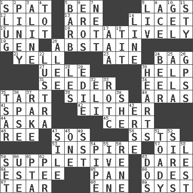 ACROSS 1. Petty quarrel 5. Benjamin's nick name 8. Straggles 12. _ and Stitch 13. "We ___ not amused" (Victoria) 14. It is permitted: Lat. 15. A single undivided whole 16. Rotating or pertaining to rotation 19. Commissioned military rank (abbr.) 20. Choose not to consume 21. Shout 23. Had dinner 24. Paper or plastic container 27. Ubangi River tributary 30. Assist 31. Sowing specialist 34. Snakelike fish 35. Small pie 38. Grain storage towers 40. Caspian sea tributary 41. Practice fight 42. One or the other 44. "____ silly question..." 45. Foregone conclusion 46. To separate or throw off 47. Mayday 50. Fast planes 53. Motivate 57. Lubricate 59. Supplementary 63. Have the gumption 64. First name in cosmetics 65. Baking dish 66. Lyric poems 67. Separate forcefully 68. Compass dir. 69. System (abbr.) DOWN 1. Strike heavily 2. Abounding in pines 3. Place in a line 4. Small child 5. Sharp remark 6. Greek god of love 7. Remaining after all deductions 8. 54 in ancient Rome 9. Adept person 10. Set 11. Filthy place 14. Actor's bit 17. Auto club (abbr.) 18. Teat (slang) 20. Toward shelter 22. A period of five years 24. Fermented drink made from hops 25. Silent film actress Nazimova 26. Global Positioning Systems (abbr.) 28. French article 29. Singer Brickell 30. Centers 32. Biblical high priest 33. College mil. group 35. Russian ruler of old 36. Domed church section 37. Immoral or dissolute person 39. A female animal or person 43. Celtic language 47. Filth; sediment 48. Single 49. Fast jet (abbr.) 51. Sycophant 52. Titles for men of rank and authority 54. Corncob 55. "Terrible" tsar 56. French philosopher Descartes 58. For fear that 59. Arrange properly for use 60. Purpose 61. Parent Teacher Association (abbr.) 62. For each 63. Two (Sp.)