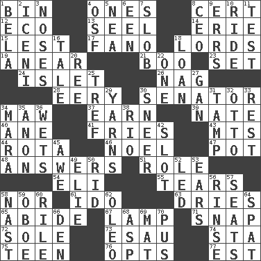 ACROSS 1. Storage container 4. Washington bills 8. An absolute certainty 12. Environmental prefix 13. Sew up the eyelids of hawks and falcons 14. One of the Great Lakes 15. For fear that 17. Papal veil 18. Nobles 19. Approach 21. Oct. 31 cry 23. Put into a specified state 24. Small island 26. Tired old horse 28. Suggestive of the supernatural 30. Legislator 34. Informal term for the mouth 37. Merit 39. Nathan's nickname 40. One (Scot) 41. Strips of potato fried in deep fat 43. Mountains (abbr.) 44. Roll call or roster of names 46. Christmas carol 47. Cooking vessel 48. Statements in reply to questions 51. Hero or heavy, e.g. 54. Connecticut Ivy Leaguer 55. Pulls apart 58. And not 61. Wedding promise 63. Frees from moisture 65. Stay 67. Desk light 71. Fastener 72. Not divided or shared with others 73. He sold his birthright 74. R.R. building 75. Adolescent 76. Chooses 77. Eastern Standard Time (abbr.) DOWN 1. Actor Lugosi 2. Ancient Celtic tribe of eastern Britain 3. Olfactory organs 4. Order of Saint Francis (abbr.) 5. Teachers' org. 6. Car or cant ending 7. Messy guy 8. Corporate head (abbr.) 9. Blunders 10. Travel on or in a vehicle 11. Trial 16. Falsehood 18. Grant temporary use of 20. To riddle 22. Single 25. Unclean, religiously 27. Separate the seeds from cotton 29. Tall tales 30. Contemptuous expression 31. Pack (down) 32. "Beetle Bailey" pooch 33. State of inaction 34. Hindu Mythology: god of death 35. At once, immediately (arch.) 36. Moistens 38. River (Sp.) 42. Slit 45. Deep reverence 49. Writer Wiesel 50. To free from 52. Directed 53. Hearing organs 56. Remove soap 57. Theater features 58. Political cartoonist Thomas 59. Mitch Miller's instrument 60. Cause heat under the collar 62. Butter sub 64. Petty quarrel 66. Lair 68. Cleo's killer 69. Floor protector 70. Fluid product of inflammation