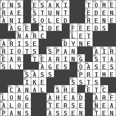 ACROSS 1. Followers of ems 4. 1973 Nobel Price Winner (Physics) Leo 9. Heavy book 13. Actress Charlotte 14. Check the growth or development of 15. Paradise 16. Cuckoo 17. Having a sole or soles 18. French philosopher Descartes 19. Personal question 21. Binary compound 22. Gives food to 24. Drug cop 26. Allow 27. Get up 29. Unit of force 30. Disturbances 31. Connect, as a bridge 33. Wind 36. Hearing organ 37. Lacerating 40. R.R. building 41. Insidious 42. Ripens 43. Fertile tracts in a desert 45. Backtalk 47. First class 48. Mamie's husband 49. Fast planes 50. Lessep's creation 52. A female animal or person 54. And so on (abbr.) 56. Having great length 57. Having the leading position 59. Sandy's bark 61. _ vera 62. Laconic 63. Teachers' org. 64. Baking dishes 65. NE Netherlands city 66. Nine, plus one DOWN 1. Epoch 2. Grandmother 3. Signiory (variant) 4. Curvy letter 5. Unemotional 6. Old (Scot.) 7. Leg joint 8. It would 9. Cylindrical with tapered ends 10. Wrote a lyric poem 11. Not women's 12. Compass dir. 20. Compass direction 22. Film actor Errol 23. Car or cant ending 25. Repose 27. Ancient Greek god of war 28. Monetary unit of Yemen 29. Raised platform 31. Sinks 32. Before (prefix) 33. Aide 34. Detail 35. To erase 38. Artist's stand 39. Republicans 44. Johnson of "Laugh-In" 45. Scorches 46. Alias (abbr.) 49. Gospel singer Marvin 50. Root beer relative 51. Soon (poet.) 52. "______ My Girl" (Turtles hit) 53. Possessive pronoun 55. Algonquian 56. Pet locale 57. _ moment's notice (2 wds.) 58. Lair 60. Avid follower