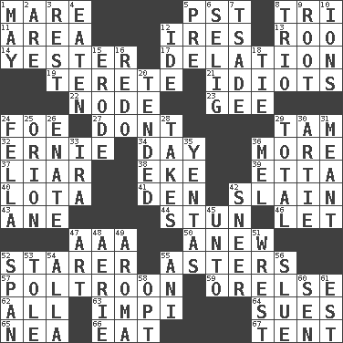 ACROSS 1. Female horse 5. Pacific Standard Time (abbr.) 8. Three (prefix) 11. Type of rug 12. Angers 13. Friend of Pooh 14. Of or pertaining to yesterday 17. Accusation by an informer 19. Cigar-shaped 21. Foolish or stupid persons 22. Thickened enlargement 23. Turn to the right 24. Enemy 27. Do not 29. Scottish cap 32. Bert's buddy 34. 24 hours 36. Greater amount 37. One who doesn't tell the truth 38. Supplement with great effort 39. Singer James 40. Globular water bottle used in Asia 41. Lair 42. Killed 43. One (Scot) 44. Surprise greatly 46. Allow 47. American Automobile Association (abbr.) 50. Afresh 52. A viewer who gazes fixedly 55. Michaelmas daisies 57. Characterized by complete cowardliness 59. Threatening words 62. 100% 63. Body of Kaffir warriors 64. Takes to court 65. Teachers' org. 66. Ingest 67. Portable shelter DOWN 1. Fifth month 2. "We ___ not amused" (Victoria) 3. Respite 4. Ingested 5. Before (prefix) 6. Former Milwaukee Brewers owner Bud 7. Sadhe (variant) 8. Musical group of three 9. Carrot, for example 10. Charged atoms 12. Binary compound 15. Eat (away) 16. Redecorate 18. Standoff 20. Looked after 24. Man or boy (slang) 25. Greek mythologigal hunter 26. Maternal 28. Proceeds 29. Add up to 30. Nick name for Arthur 31. Intended 33. Retirement account (abbr.) 35. Gossips 36. Cartoonist voice _ Blanc 42. Scornful expression 45. To (old English) 47. Nonscientific branch of learning 48. Nest on high 49. Odor 51. Obtain by seizing forcibly or violently 52. Connect, as a bridge 53. Lacquered or enameled metalware 54. Silent film actress Nazimova 55. Black tropical American cuckoo 56. Turn sharply 58. Choose 60. Elected rep. 61. Eastern Standard Time (abbr.)