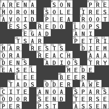 ACROSS 1. Sports stadium 6. Manchild 9. Before (prefix) 12. Person of subnormal intelligence 13. Flatfish 14. Angers 15. Stay clear from 16. Entreaty 17. Carrot, for example 18. Double-curved letter 19. Do over again 20. Chops off 21. Mild oath 23. Cuckoo 24. Russian ruler of old 25. _ dish (used to culture cells) 28. Third mo. 30. Musical pauses 34. South Vietnam president (1954) 35. Mouth or opening 36. Arrive at 38. American Automobile Association (abbr.) 39. Lairs 41. Goodbye (Sp.) 43. Attempt 44. Artist's stand 46. Ancient Persian 48. Area sheltered from the wind 49. Fermented drink made from hops 50. Small boys 51. Baltic tributary 53. Deep reverence 56. Quote 57. Small Philippine buffalo 58. Practice fights 60. Scent 61. Transmit 62. Laconic 63. For each 64. Pacific Standard Time (abbr.) 65. NE Netherlands city DOWN 1. Nursemaid (var.) 2. Be footloose 3. Greek god of love 4. Annoying sounds 5. Also 6. Disposed of to a purchaser 7. Butter sub 8. Teachers' org. 9. Conciliate 10. Vintage cars 11. Eastern Standard Time (abbr.) 13. Broke a traffic law 14. Pressed 19. More valued for its uncommonness 20. Pet locale 22. Slender fish 24. Interpreter 26. Located in or toward the back 27. "If ____ say so..." 28. Method 29. Length times width 31. Ocean 32. Bit 33. _-fi 37. Simpsons dad 40. Sowing specialist 42. Observe 45. French article 47. Window treatments 49. Necklace unit 50. Periodic rise and fall of the sea level 51. Washington bills 52. Do not 54. Armed conflicts 55. Celtic language 56. Police officer (slang) 57. Viper 58. R.R. building 59. Elected rep.