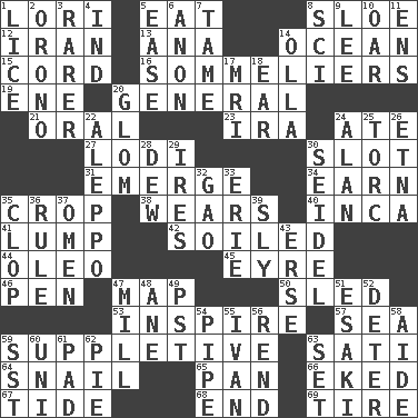 ACROSS 1. Australian parrot (variant) 5. Consume 8. _ gin 12. SW Asia republic 13. Santa ___, CA 14. Sea 15. Drawstring 16. Wine waiters 19. Compass dir. 20. Commissioned military rank 21. Taken by mouth 23. Lyricist Gershwin 24. Had dinner 27. Farming town in central California 30. Narrow opening 31. Develop 34. Merit 35. Riding implement 38. Erodes 40. South American Indian 41. Mass 42. Dirtied 44. Margarine 45. Jane of fiction 46. Writing instrument 47. Atlas unit 50. Downhill vehicle 53. Stimulate to action 57. Ocean 59. Supplying deficiencies 63. Suttee (variant) 64. Slow-paced one 65. Baking dish 66. Made supply last 67. Event that recurs at intervals 68. Conclude 69. Hoop that covers a wheel DOWN 1. Louse (plural) 2. U. of Maine site 3. Less widely known 4. Indiana (abbr.) 5. Relaxation 6. Soon (poet.) 7. Not wild 8. _-fi 9. Area sheltered from the wind 10. Rowing implement 11. Followers of ems 14. Rounded earthenware pot or jar 17. Medical imaging device (abbr.) 18. Hearing organ 20. Take by theft 22. City in Syria 24. Actor Alda or Thicke 25. Torque (variant) 26. Inactive volcano in Sicily 28. Morning condensation 29. Angers 30. A glass for beer 32. E Mali city 33. 4th largest of the Great Lakes 35. Hoof sound 36. Governing power 37. Sign of things to come 39. Roguish 43. Celtic language 47. Place where flour is made 48. One (Scot) 49. Pacific Standard Time (abbr.) 51. 1973 Nobel Price Winner (Physics) Leo 52. Prevent from occurring 54. Corncob 55. "Terrible" tsar 56. Tear apart 58. Assistant 59. Fast jet (abbr.) 60. University (slang) 61. Writing tablet 62. Sliced dessert 63. Arrange properly for use
