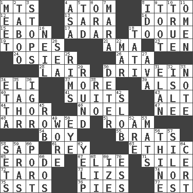 ACROSS 1. Mountains (abbr.) 4. Tiny particle 8. "Tell ____ the Marines!" 12. Consume 13. "Two Mules for Sister ____" 14. Dormintory (informal) 15. Inky black, to poets 17. The sixth month of the Jewish calendar 18. Woman's close-fitting hat 19. Drinks excessively 21. Nursemaid (var.) 23. Nine, plus one 24. Flexible twig of a willow tree 26. "One Day ___ Time" 28. Den 30. Popular '50s hangout 34. Connecticut Ivy Leaguer 37. Greater amount 39. In addition 40. Label 41. Sets or collections 43. Keyboard modifier key 44. Son of Odin 46. Christmas carol 47. Born 48. Moved like an arrow 51. Wander 54. Male child 55. Naughty children 58. Plant excrement 61. Marina Del _, California 63. Value system 65. Wear away 67. Writer Wiesel 71. Drop; flow; fall 72. Pacific island yam 73. Belonging to Elizabeth 74. And not 75. Fast planes 76. Sliced desserts 77. Eastern Standard Time (abbr.) DOWN 1. Rendezvous 2. Off limits 3. Discontinues 4. White ___ sheet 5. Bit 6. Mouth or opening 7. Hindu Mythology: god of death 8. Wedding promise 9. A blast of a horn 10. Loyal 11. Sign of things to come 16. Famous astronaut Armstrong 18. Jacques of French films 20. Ocean 22. Make imperfect 25. Basketball hoops 27. Actress Gardner 29. Single shot of ammunition 30. Prevent from occurring 31. Flair 32. Capri or Wight 33. Musical sound 34. Singer James 35. Cowardly lion portrayer 36. Composer Stravinsky 38. River (Sp.) 42. Messy guy 45. Director Reiner 49. Had on 50. Sight organ 52. "We ___ not amused" (Victoria) 53. Floor coverings 56. One or ones belonging to thee 57. Grain storage towers 58. Puts into a specified state 59. Ancient river in northeast Turkey 60. Left side of a ship or aircraft 62. Sharp bark 64. Foregone conclusion 66. Two (Sp.) 68. Cards in a Roman deck? 69. Ending with capital 70. Double-curved letter
