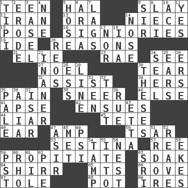 ACROSS 1. Adolescent 5. Actor Linden 8. Kill 12. SW Asia republic 13. Mouth or opening 14. Sibling's daughter 15. Introduce or present, as a question 16. Seigniories (variant) 19. Binary compound 20. Thinks logically 21. Writer Wiesel 23. Actress Charlotte 24. Observe 27. Christmas carol 30. Pull into pieces 31. Help 34. Possessive pronoun 35. Ache 38. Scornful expression 40. Otherwise 41. Domed church section 42. Takes place subsequently 44. One who doesn't tell the truth 45. False hair 46. Hearing organ 47. Electrical Unit 50. Russian ruler of old 53. French poetic form 57. To separate or throw off 59. Appease 63. Neighbor of Neb. 64. Bake eggs in their shells 65. Mountains (abbr.) 66. Be footloose 67. Lacquered or enameled metalware 68. Plant holder 69. Angers DOWN 1. Native american tent (variation) 2. Wear away 3. Artist's stand 4. Compass dir. 5. Flexible conduit 6. Operatic vocal solo 7. Falls behind 8. Title for a knight 9. Flowery wreath 10. Adept person 11. Consenting reply 14. Sense of smell 17. And not 18. _ tizzy (2 wds.) 20. Vintage cars 22. Sillier 24. Sew up the eyelids of hawks and falcons 25. Hearing organs 26. Celtic language 28. Curvy letter 29. Actor's bit 30. College papers 32. Elected rep. 33. Trial 35. Light colored 36. Capital of Western Samoa 37. Austrian river, tributary to the Danube 39. Sorrow 43. Singer James 47. SW Saudi Arabia district 48. Was introduced to 49. 23rd letter of the Greek alphabet 51. Zeal 52. Break or tear apart 54. Pack (down) 55. "Tell ____ the Marines!" 56. A home for chicks 58. Makes supply last 59. Pacific Standard Time (abbr.) 60. 17th letter of the Greek alphabet 61. Lubricate 62. Before (prefix) 63. Indian title of respect (Mr.)