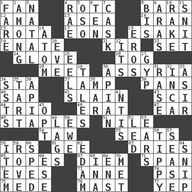 ACROSS 1. Avid follower 4. College mil. group 8. Soap units 12. Wet nurse (var.) 13. Toward the sea 14. SW Asia republic 15. Round or rotation of duties 17. Immeasurably long periods of time 18. 1973 Nobel Price Winner (Physics) Leo 19. Maternal 21. Apertif with cassis 23. Put into a specified state 24. Michael Jackson trademark 26. Coat; cloak 28. Rendezvous 30. Nineveh was its capital 34. R.R. building 37. Desk light 39. Zero-star reviews 40. Plant excrement 41. Killed 43. _-fi 44. Musical group of three 46. Part of Q.E.F. 47. Hearing organ 48. Paper fasteners 51. The longest river in the world 54. The 23rd letter of the Hebrew alphabet 55. Theater features 58. Big collection agency 61. Unit of force equal to gravity 63. Frees from moisture 65. Drinks excessively 67. South Vietnam president (1954) 71. Connect, as a bridge 72. Nights before holidays 73. Queen of England 1702-14 74. Air pressure measure (abbr.) 75. Ancient Persian 76. Vertical spar for supporting sails 77. Slangy assent DOWN 1. Conductor's collection 2. Amid 3. Relating to or accompanying birth 4. Actress Charlotte 5. Bear (Spanish) 6. "___ Little Indians" 7. Keg 8. Again 9. Caspian sea tributary 10. Libertine 11. In a ____ (agitated or irritated) 16. Tiny particle 18. Greek god of love 20. First lady 22. It is 25. Snakelike fish 27. Flimflam 29. Falsehoods 30. Bee-related 31. To erase 32. South American Indian 33. SW Saudi Arabia district 34. Fast planes 35. Small pie 36. Capital of Western Samoa 38. Make imperfect 42. Nuclear Threat Initiatives 45. Choose 49. Falls behind 50. She-sheep 52. Directed 53. Hearing organs 56. Likely to tip or tilt 57. Gospel singer Marvin 58. Detail 59. Be footloose 60. Drove too fast 62. Dutch treat 64. Sever or remove by pinching or nipping 66. Compass dir. 68. _ tizzy (2 wds.) 69. Followers of ems 70. Was introduced to