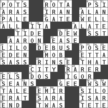 ACROSS 1. Plant holders 5. Roll call or roster of names 9. 23rd letter of the Greek alphabet 12. Ancient river in northeast Turkey 13. SW Asia republic 14. Actor Alda or Thicke 15. Light colored 16. Yard entry 17. Water source 18. 100% 19. Call ___ day 21. Having winglike extensions 22. Event that recurs at intervals 24. Morning condensation 26. Fast jet (abbr.) 27. Composer Copland 28. Relaxation 29. _ and Stitch 30. Alight from a bus 32. Airs 36. Genesis locale 37. Crowd into 38. Singer James 39. Backtalk 40. Wash lightly 42. Not this but _ 43. Municipality 44. Less widely known 46. Raised railways 49. Two (Sp.) 50. Russian composer Stravinsky 51. Actors Connery and Penn 53. Unit of force equal to gravity 54. Compass dir. 57. Lie 58. Arab leader 61. Grain storage tower 62. Part of Q.E.F. 63. "Two Mules for Sister ____" 64. Austrian river, tributary to the Danube 65. Conclude 66. It was, poetically 67. Wig DOWN 1. Dad 2. Of the mouth 3. Baron Munchausen's specialties 4. Compass dir. 5. Capital of Latvia 6. Mouth or opening 7. Make lace 8. A saturated hydrocarbon 9. Entreaties 10. Table seasonings 11. An arm off of a larger body of water 14. Leather borer 19. Wedding promise 20. Be inclined (to) 21. Deep reverence 23. Removes the wrinkles 24. Applies to a surface 25. Curvy letter 27. Opera by Verdi 28. Black 29. French article 31. Gives off 32. Stone: prefix 33. Else 34. Play the lead 35. Erode 40. River (Sp.) 41. One of the Great Lakes 43. Music discs 45. Ripen 46. First name in cosmetics 47. Acquire or gain knowledge or skills 48. First course 52. Fish or hair follower 53. Pate de foie ____ 55. Narrow board 56. Had on 58. Eastern Standard Time (abbr.) 59. Opening into something insatiable 60. Lyricist Gershwin 61. Be seated