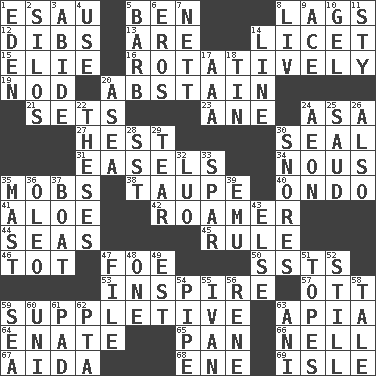 ACROSS 1. He sold his birthright 5. Benjamin's nick name 8. Fails to keep up a pace 12. Rights 13. "We ___ not amused" (Victoria) 14. It is permitted: Lat. 15. Writer Wiesel 16. Happening in regular succession 19. Dreamland 20. Refrain by choice 21. Puts into a specified state 23. One (Scot) 24. White ___ sheet 27. Behest 30. Lick closed 31. Artist's stands 34. Good sense 35. Disorderly crowds 38. Grayish beige 40. Southwest Nigerian state 41. Medicinal plant 42. Wanderer 44. Oceans 45. Governing power 46. Small child 47. Enemy 50. Fast planes 53. Heighten or intensify 57. Baseball player Mel 59. Supplementary 63. Capital of Western Samoa 64. Maternal 65. Baking dish 66. 1994 drama film starring Jodie Foster 67. Opera by Verdi 68. Compass dir. 69. Capri or Wight DOWN 1. Paradise 2. Grain storage towers 3. Tolerate 4. Purpose 5. Sharp remark 6. Greek god of love 7. Remaining after all deductions 8. 54 in ancient Rome 9. Adept person 10. Set 11. Filthy place 14. Actor's bit 17. Auto club (abbr.) 18. Metal container 20. At sea 22. College papers 24. Period of immesurable duration 25. Saudi Arabian king (1953-1964) 26. In addition 28. Fast jet (abbr.) 29. Lacerate 30. Sounds asleep 32. Nilotic language 33. Coast Guard woman 35. Vertical spar for supporting sails 36. Butter sub 37. Water vessel 39. Australian flightless bird 43. Otherwise 47. Do some clerical work 48. Single 49. Eastern Standard Time (abbr.) 51. Drinks excessively 52. Free of sound 54. Corncob 55. "Terrible" tsar 56. French philosopher Descartes 58. Lie 59. Ocean 60. University (slang) 61. Groovy apt. 62. Parent Teacher Association (abbr.) 63. Cuckoo