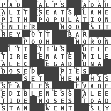 ACROSS 1. Groovy apt. 4. High mountains 8. The sixth month of the Jewish calendar 12. Came down and settled, as after flight 14. Theater features 16. Unable to walk 17. Heart or essence 18. Census information 20. Keyboard key 22. Dreamland 23. Be seated 24. Marina Del _, California 25. Baseball player Mel 28. Drinking establishment 30. "Silly old bear" 31. Person of subnormal intelligence 35. Cards in a Roman deck? 37. Airtight sealed metal containers 40. Ubangi River tributary 41. Hoop that covers a wheel 42. Related on the mother's side 44. "Death on the ____" 45. Actor Baldwin 46. Mild oath 47. Heredity factor (abbr.) 48. Administered medicine 50. Sliced desserts 52. Put into a specified state 54. Layer 55. Part of HMS, perhaps 58. Ocean 61. French article 63. Dodge 65. The property of being fit to eat 70. Toward shelter 71. Periodic rise and fall of the sea level 72. Olfactory organs 73. Frog relative 74. Comedian Laurel of Laurel & Hardy 75. Left 76. Insidious DOWN 1. Some stationery 2. Place in a line 3. Short, simple song 4. Viper 5. Lion 6. Infant food 7. Astound 8. Keyboard modifier key 9. Raised platform 10. Mine, in Marseilles 11. Monthly bill 13. Definite Article 15. Oscar Madison type 19. First of billions? 21. Friend of Pooh 26. Carryall 27. One or ones belonging to thee 29. Periods in a boxing match 30. Parts 32. It's straight from the horse's mouth 33. Rounded earthenware pot or jar 34. Born 35. _ and Stitch 36. Angers 38. Tired old horse 39. Staphylococcus 41. Bit 43. Singer Brickell 49. Small valley 51. Compass dir. 53. Adolescent 55. Saint headwear 56. Standard of perfection 57. Sleazy 58. Arranges properly for use 59. Prepare for publication 60. Opera by Verdi 62. Frozen precipitation 64. Large container 66. Benjamin's nick name 67. Compass dir. 68. Elected rep. 69. Fast jet (abbr.)