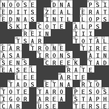 ACROSS 1. Trap for birds or small mammals 6. Heredity factor (abbr.) 9. 23rd letter of the Greek alphabet 12. Prepares for publication 13. Ardor 14. Part of Q.E.F. 15. Ferber et al. 16. International (abbr.) 17. Chops off 18. What Jean-Claude Killy likes to do 19. ____ d'Azur (French Riviera) 20. High mountains 21. It's straight from the horse's mouth 23. One more than two 24. Russian ruler of old 25. "_____ Recall" 28. Hearing organ 30. Marketplace scale 34. Hoop that covers a wheel 35. White ___ sheet 36. Metal shackles 38. The 18th letter of the Arabic alphabet 39. Elected reps. 41. Small stream 43. Small amount or degree 44. Artist's stand 46. Pace 48. Area sheltered from the wind 49. Johnson of "Laugh-In" 50. Small boys 51. Inactive volcano in Sicily 53. River (Sp.) 56. Carryall 57. Edible starchy tuberous root 58. Mexican monetary units 60. Russian composer Stravinsky 61. Length times width 62. Staphylococcus 63. Automobile 64. Purpose 65. Laconic DOWN 1. Born 2. Likelihood 3. Pig sound 4. Flight of steps 5. Double-curved letter 6. Scratch 7. Nathan's nickname 8. Everything 9. Appease 10. Plant excrements 11. It is 13. The Jewish people; Israel 14. American author Paul (1891-1958) 19. High-altitude cloud 20. Small island 22. Consume 24. Interpreter 26. Roberta Peters solo 27. Grant temporary use of 28. Relaxation 29. Toward the sea 31. The grampus (Milton) 32. Or not 33. Compass dir. 37. Father Junipero _ 40. Sowing specialist 42. Krazy ___ of comics 45. French article 47. Cigar-shaped 49. Small Philippine buffalo 50. Ancient Roman robe 51. Hearing organs 52. Relationship diagram 54. Austrian river, tributary to the Danube 55. I made a mistake 56. Nervous spasm 57. The 19th letter of the Greek alphabet 58. Pacific Standard Time (abbr.) 59. A female animal or person